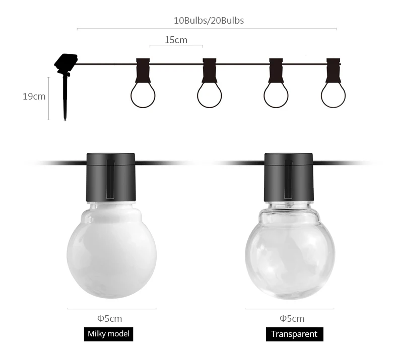 1. Тип: светодиодный светильник на солнечной батарее2. Корпус лампы: прозрачный/молочный3. Длина: 2,5 M/5M4. Светильник: белый/теплый белый5. Аккумулятор: встроенный аккумулятор емкостью 600 мАч Ni-MH6. Время зарядки: 6 часов7. Время работы: 6-10 часов, общее время работы более 10000 часов8. Режим светильник: устойчивая вспышка9. Количество светодиодный: 10 шт/20 шт10. Батарея: 1,2 V 600MA11. Солнечная панель: 2 в 100 мА12. Срок службы: 10000 ч13. Метод управления: светильник (только Ночной светильник или темное)