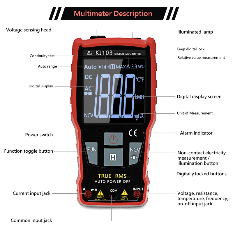 Цифровой мультиметр Handskit, измеритель напряжения TRUE RMS, с ЖК-дисплеем, 2000 отсчетов, переменныйпостоянный ток, с зажимом Probles 2
