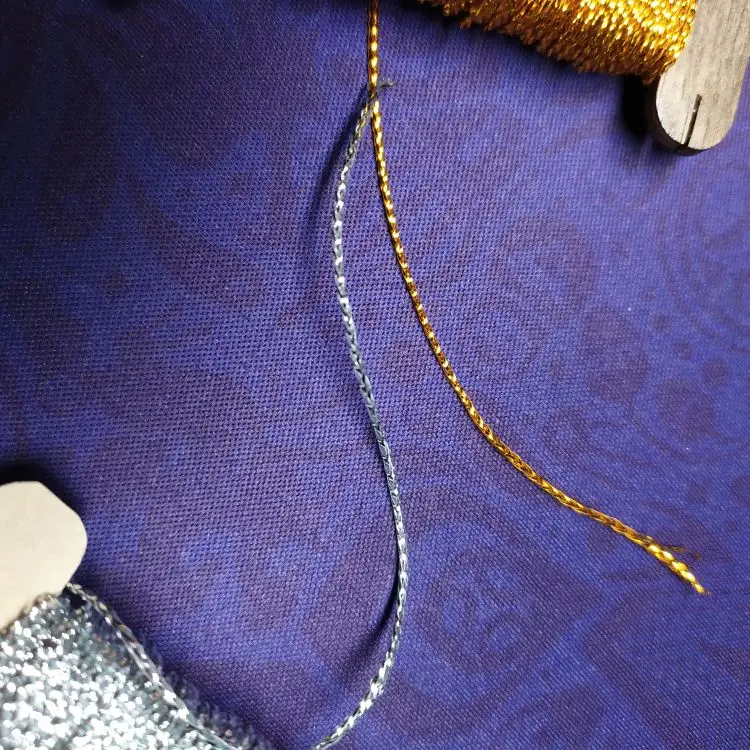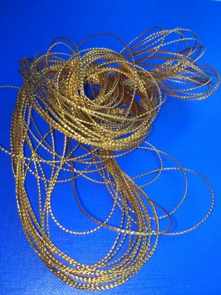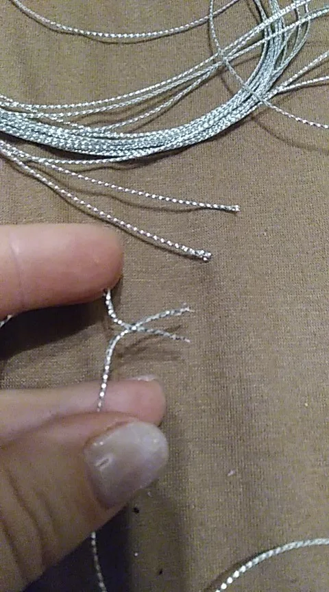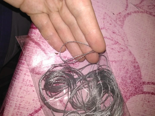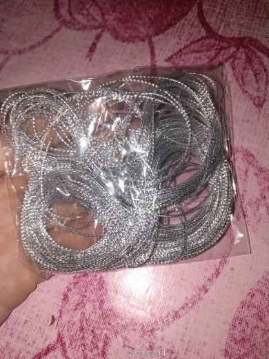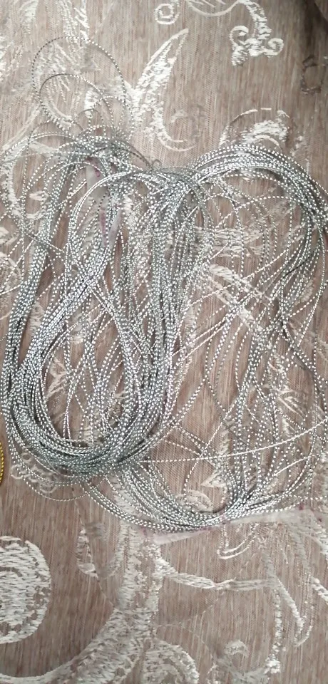 Это достаточно эластичный шнур, примерно 1 мм в диаметре, круглый. Обрабатывать им одежду не советую - серебристая канитель, которая находится в составе, достаточно жесткая и будет царапать кожу (знаю по себе, так как подобным золотым шнуром украшен ворот моей блузки, и этот край натирает мне шею). Подойдет для поделок или для подвешивания елочных игрушек - крупных шаров.