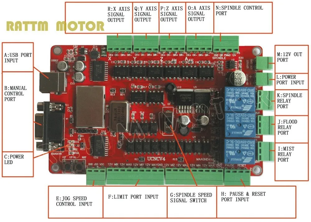 N) выходной интерфейс управления шпинделем: определения поворота для GND DIR PWM2 12V, соответственно, это выход сигнала заземления, направления, шпиндель 0 ~ 10V контроль скорости, выход сигнала 12V.