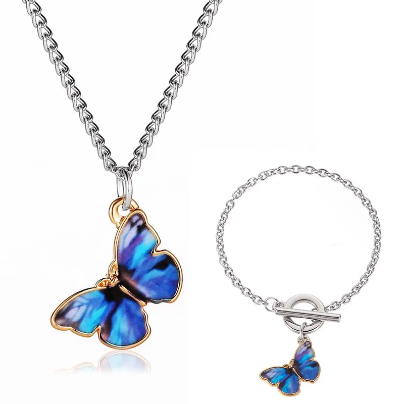 Комплект из колье и браслета, с бабочкой, серебристого цвета