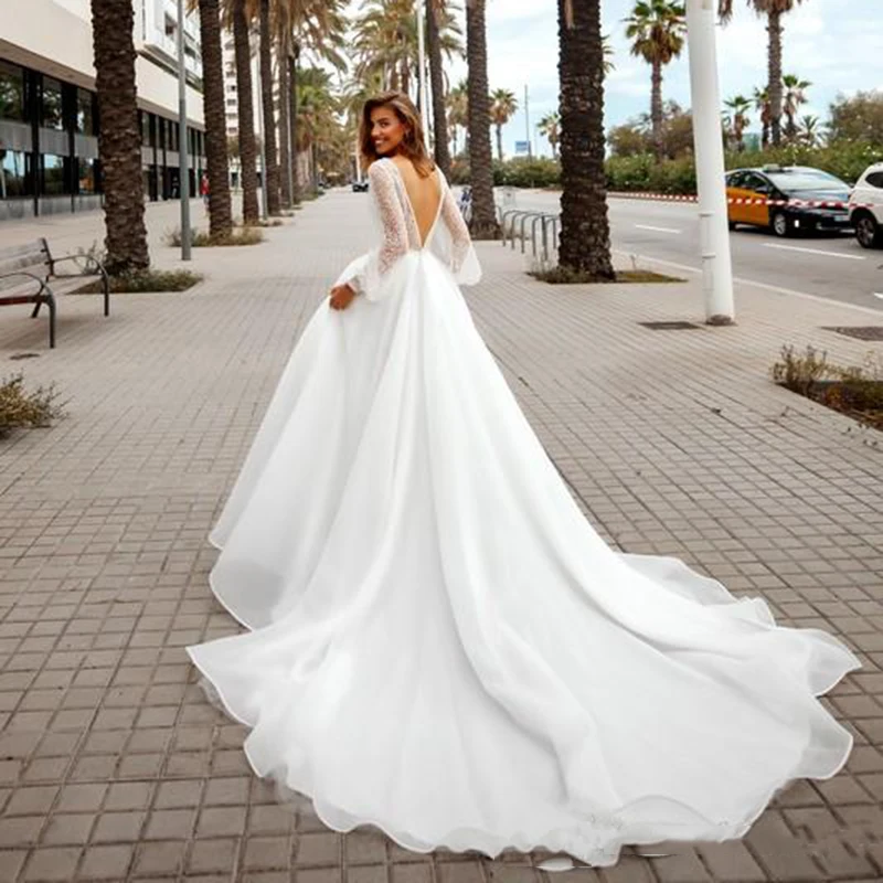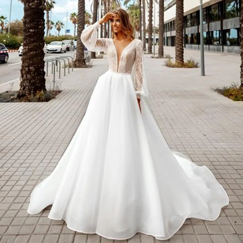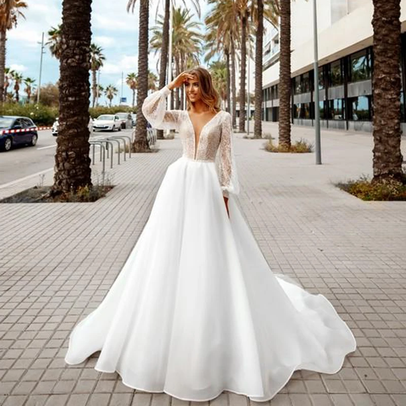 Женское свадебное платье с длинным рукавом, кружевное платье с V-об...