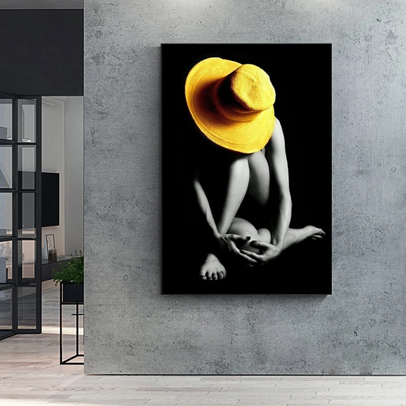Привлекательная Обнаженная женщина, холст, художественная живопись, современные плакаты и принты, одежда для девушек, желтая шляпа, Настенная картина для гостиной, домашний декор