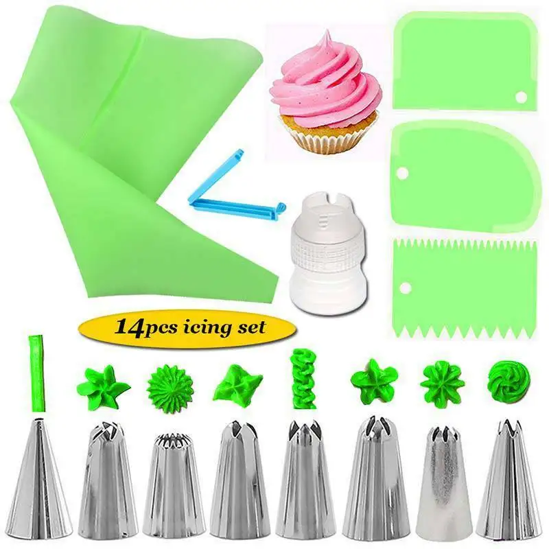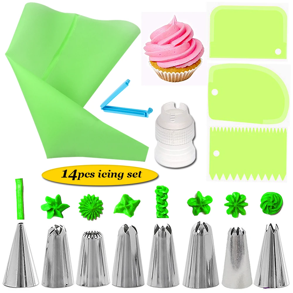14 шт./компл. набор соплов из нержавеющей стали силиконовая глазурь трубопровод крем Кондитерская выдавливаемая сумка конвертер карманный зажим скребок DIY Инструменты для торта Посылка включает в себя:8x сопла для обледенения из нержавеющей стали1x сумка для сжатия1x конвертер1x карманный зажим3х скребок