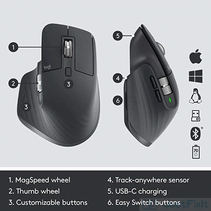 Мышь MX Master 3 Высота x Ширина x глубина: 4,91 дюйма (124,9 мм) x 3,31 дюйма (84,3 мм) x2.0 дюйма (51 мм) Вес: 5,0 унций (141 г) usb-приемник Высота x Ширина x глубина: 0,72 дюйма (18,4 мм) x 0,56 дюйма (14,4 мм) X. 26 дюймов (6,6 мм) Вес: 0,07 унций (2 г) системные требования требуется usb-приемник: имеется usb-порт Windows®7, Windows 8, Windows 10 или более поздние версии macOS®10,13 или более поздняя версия Bluetooth Linux®Требуется: технология Bluetooth с низким энергопотреблением Windows 8, Windows 10 или более поздней версии macOS 10,13 или более поздней версии Linux Технические характеристики Сенсорная технология Darkfield Высокая точность номинальное значение: 1000 точек/дюйм (минимальное и максимальное значение): 200 до 4000 точек/дюйм (может быть установлен в с шагом 50 точек/дюйм) кнопки 7 кнопок (левый/правой кнопкой мыши, вперед/назад, Приложение-переключатель, режим колеса-сдвиг, средний щелчок) Колесо прокрутки: Да, с автоматическим сдвигом: Да Кнопка жеста: да беспроводное рабочее расстояние 10m7 беспроводная технология Advanced 2,4 ГГц Беспроводная технология аккумуляторная батарея Li-Po (500 мАч) батарея получите три часа использования от одной минуты быстрой зарядки 5. Опциональное программное обеспечение: опционы логитеч и логитеч поток.