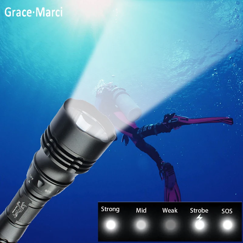 Светодиодный фонарик CREE для дайвингаМатериал: алюминиевый сплавРазмеры: 15,8*4,5*2,8 см; Вес: 185 гIP68 водонепроницаемый, подводный более 50 метровСветодиодный источник: CREE XM-L2 или XML T6 светодиодный холодный белый светильникРежимы работы: 5 режимов (высокий, средний, низкий, стробоскоп, sos)Максимальная яркость: 1000 люменТип батареи: аккумулятор 18650Время освещения: 2-5 часовПосылка 1: фонарик и белая коробка, без аккумулятора;Посылка 2: фонарик, аккумулятор и зарядное устройство;