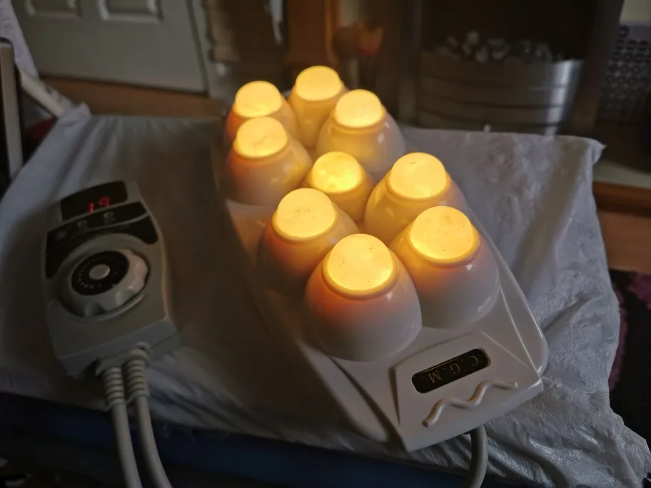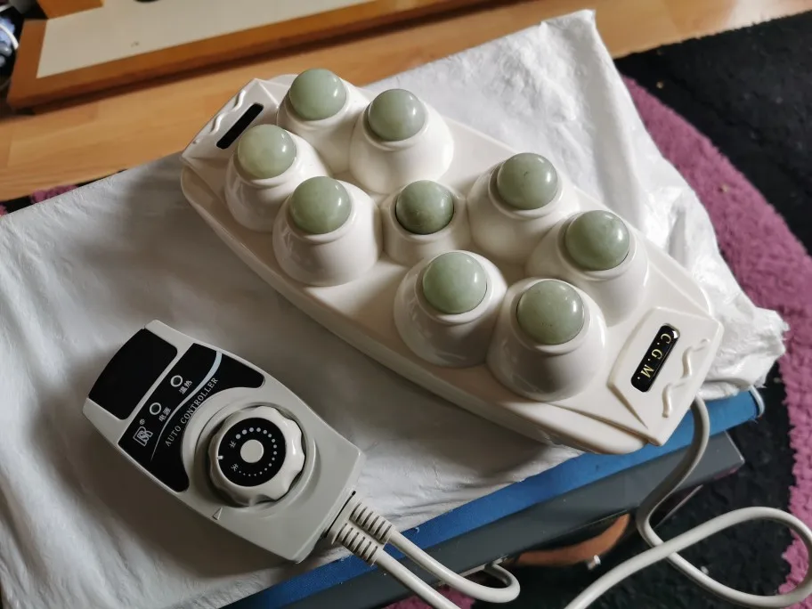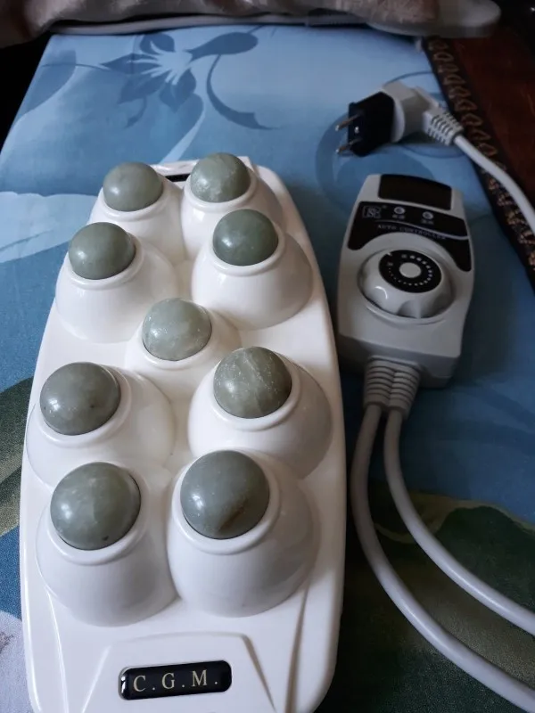 Looks as in the picture. It's def not real jade, cause it easily scratches by knife and has a waxy luster, it's most probably serpentine and low quality as has many impurities (black spots and dots). Heats ok, cord EU ok, plastic has unpleasant odour (the same when rubber melts) but not too intense, looks cheap (but do we care?). Works ok. After the first massage session, I feel the same relaxed like when I used ceragem compact. So for this price - it's OK quality. Hope it will do it's job for at least for a year.