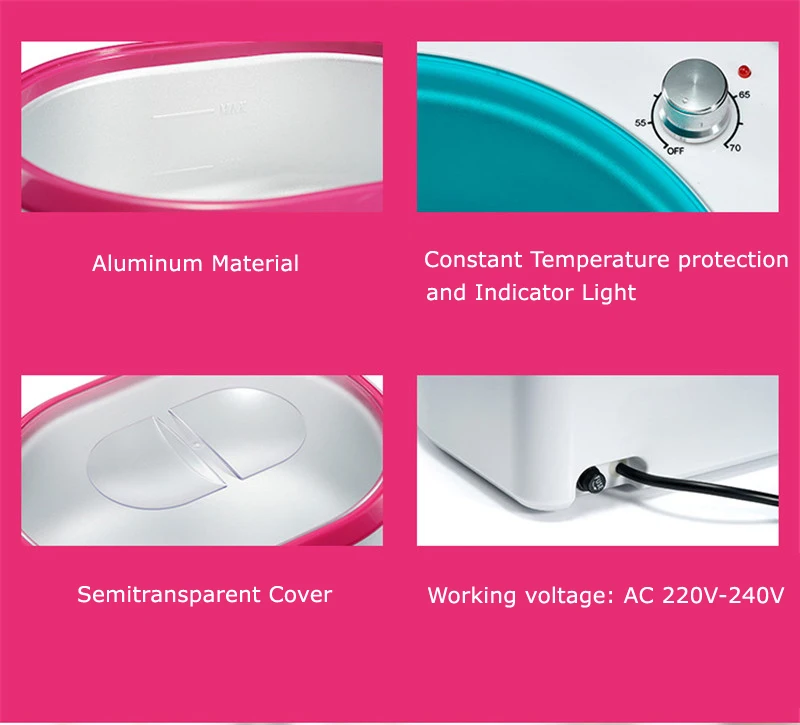 Обработка парафиномПоставьте машинку на плоский стол.Поднимите крышку, положите парафин в машину, затем закройте крышку.Подключите к питанию, нажмите кнопку переключения на 70 ℃, машина начнет работать после того, как светильник загорится красным.Нажмите кнопку переключения на 55 ℃ для сохранения нагрева, когда парафин расплавился, проверьте температуру перед использованием воска, используйте его, когда температура подходит.Очистите кожу перед лечением.Используйте кисть равномерно намажьте на парафин к вашей коже; Слегка разорвите воск после высыхания парафина.Используйте специальное очищающее средство для очистки остаточного воска в машине после использования d.