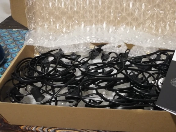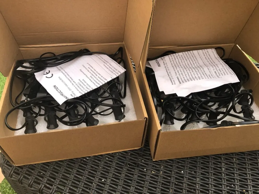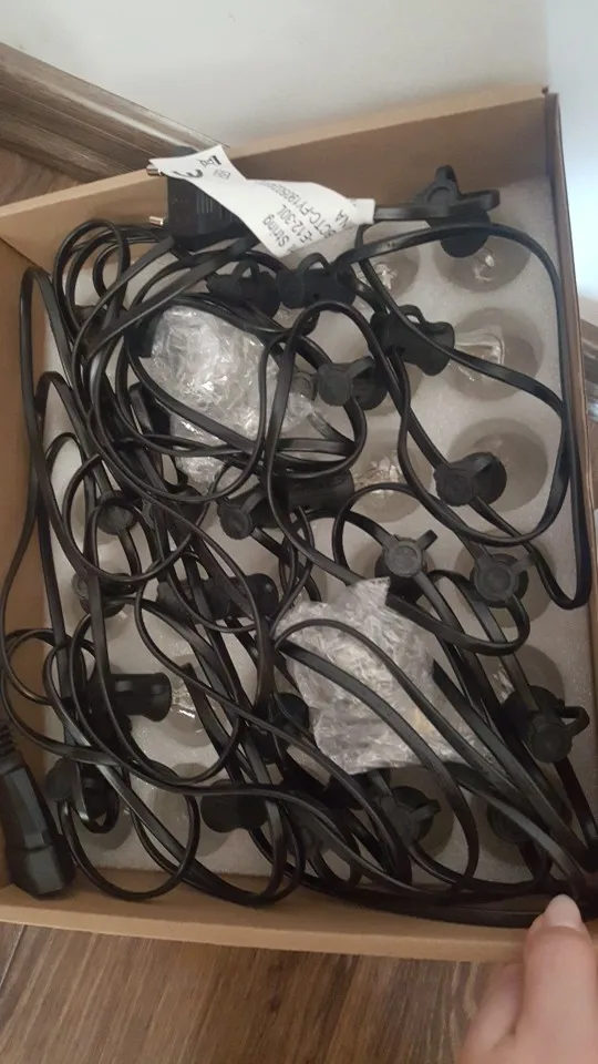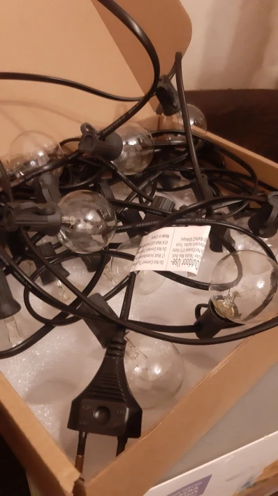Товар дошел за две недели, упакован очень хорошо, все цело, две запасные лампочки. Вилка ( в неработающем состоянии) защищена "крышкой" от непогоды. Цвет лампочек теплый, уютный.