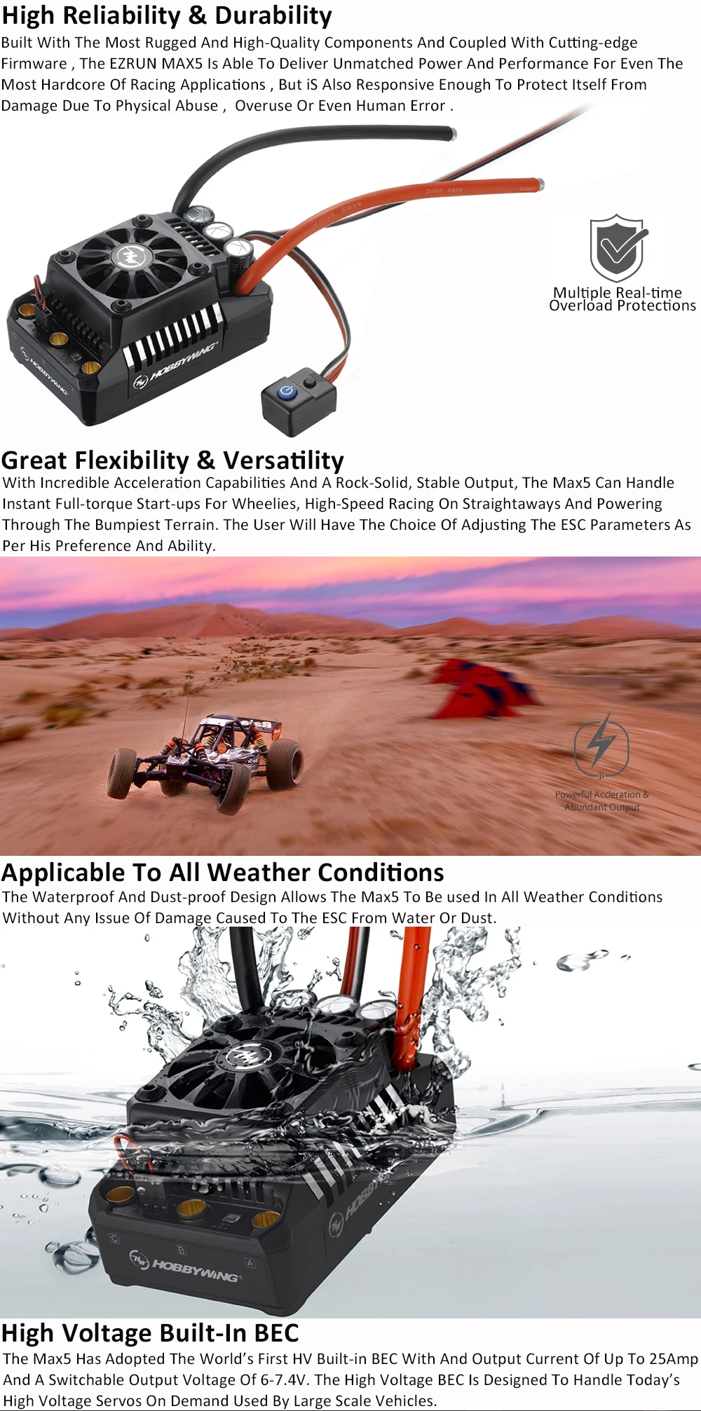 Безбесщеточный двигатель HobbyWing 56113SL 800KVHttp://www.hobbywing.com/products/enpdf/EZRUN4985.pdfОсобенности:• Пресс-форма-4 полюса ротора катушки, обеспечивающий отсутствие вибрации при высокий крутящий момент, быстрое ускорение, отклик и стабильную выходную мощность. • Специальная технология контроля температуры, реализуемая этим двигателем, гарантирует меньшую эффективность нагрева (коэффициент эффективности до 90%).• CNC алюминиевое снабжение жилья светом, высокой чистоты меди обмоток, расширенный ротора структура, 0,2 мм кремния стали кремния, высококачественная нержавеющая сталь выходной вал, высокоточные подшипники для высокой прочности и гладкости.• Перестраиваемая конструкция (частично восстановленная) для планового обслуживания эффективно продлевает срок службы двигателя и повышает эффективность двигателя. • Этот двигатель EZRUN идеально подходит для HOBBYWING EZRUN MAX6/5 ESC.• Порт датчика температуры обеспечивает всестороннюю защиту энергосистемы (Hobbywing разработает некоторые ESCs с функцией тепловой защиты двигателя для сопряжения этих двигателей в будущем).HobbyWing EZRUN 56113SL-800KV Мотор:КВ: 800Lipos:3-8SСопротивление (Ω): 0,0049Ток холостого хода: 3,2Рабочий ток (А):200Выходная мощность (Вт):5800O.D./длина (мм):φ = 56 мм (2,2 дюйма)/L = 113 мм (4,45 дюйма)Вал Диаметр/Длина (мм): Φ = 8,0 мм (0.31In)/L = 31 мм (1.22In)Полюсы: 4Вес (г):1210 г (42,68 унций)Применение: 1/5 RC транспортные средстваHobbywing EZRUN Max5 V3 200A водонепроницаемый ESCHttps://www.hobbywing.com/goods.php?id=405Hobbwing EZRUN бесщеточный Бесконтактный водонепроницаемый MAX5 200A ESC:Масштаб: 1:5Cont. /Пиковый ток: 200A/1300A;Входное напряжение: 3-8S Lipo/ 9-24 ячейки NiMH;Выход BEC: режим переключения 6V/7,4 V, 6A;Входной провод: Red-8AWG-200mm * 1/Black-8AWG-200mm * 1;Выходной провод: Black-10AWG-200mm * 3;Выход разъемы: 6,5 мм Женский Позолоченные разъемы (предплатные на печатную плату);Размер вентилятора: 45*45*10 мм;Вентилятор Напряжение диапазон: 5-7,4 V;Питание вентилятора: BECПрограмма ESC: кнопка установки на ESC, светодиодный программный блок, ЖК-дисплей, модуль WIFI,Программист OTA. (Порт программы: порт вентилятора/программы);Обновление прошивки: поддерживаетсяРазмер ESC: 93,4*58,1*47,8 мм;Вес ESC: 342 г;Применение:Двигатели: SL BL Motors/ SD BL Motors (только в режиме SL);Транспортные средства: 1/5 туристический автомобиль/багги/грузовик;Оценка КВ/T Количество: 8S Lipo KV≤ 1000(58110 Размер моторов)