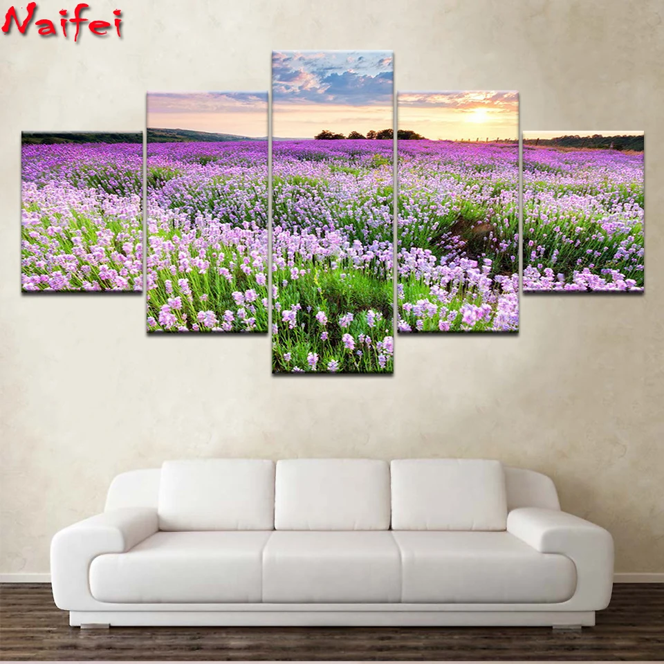 Алмазная картина, вышивка, популярные Лавандовые поля Прованса, 5 панелей, алмазная настенная живопись, алмазная живопись для декора гостиной