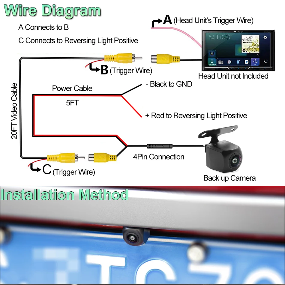 1. Найдите плоскую поверхность (параллельную земле) для крепления камеры, затем закрепите гайку и болт на месте.2. Подключите кабель питания к источнику питания заднего хода.3. Подключите 6-метровый Удлинительный провод резервной камеры к Головному Устройству/другим мониторам вашего автомобиля.4. Запустите автомобиль и передачу на задний ход, чтобы проверить камеру.5. Повторно установите головное устройство/другие мониторы.
