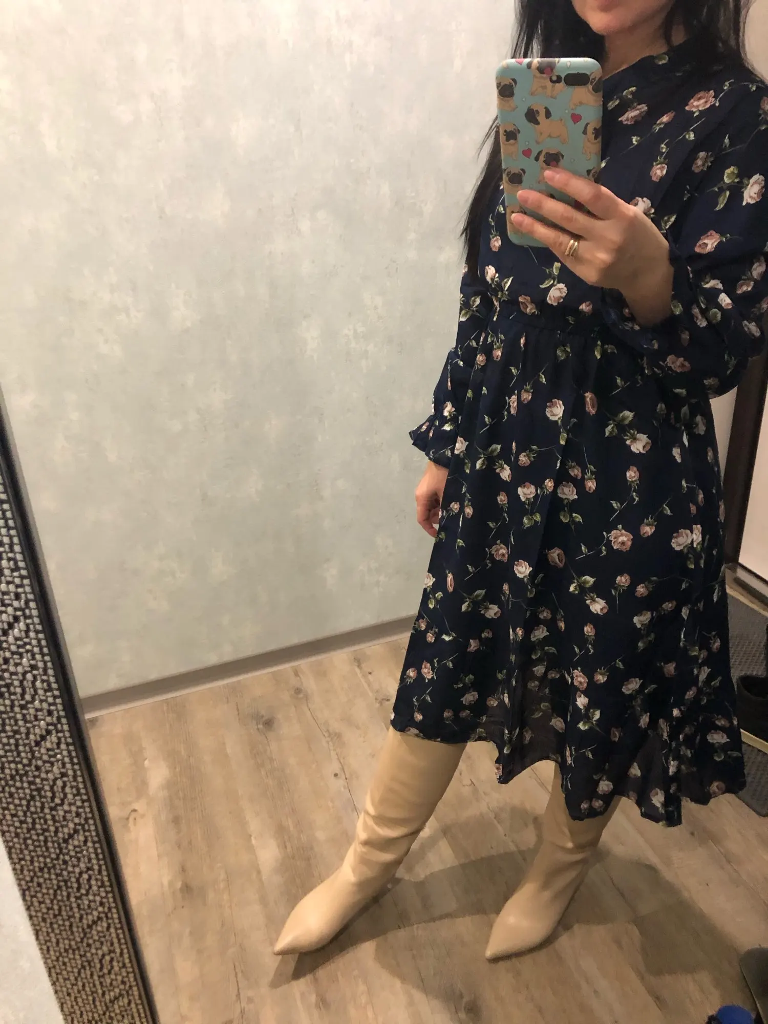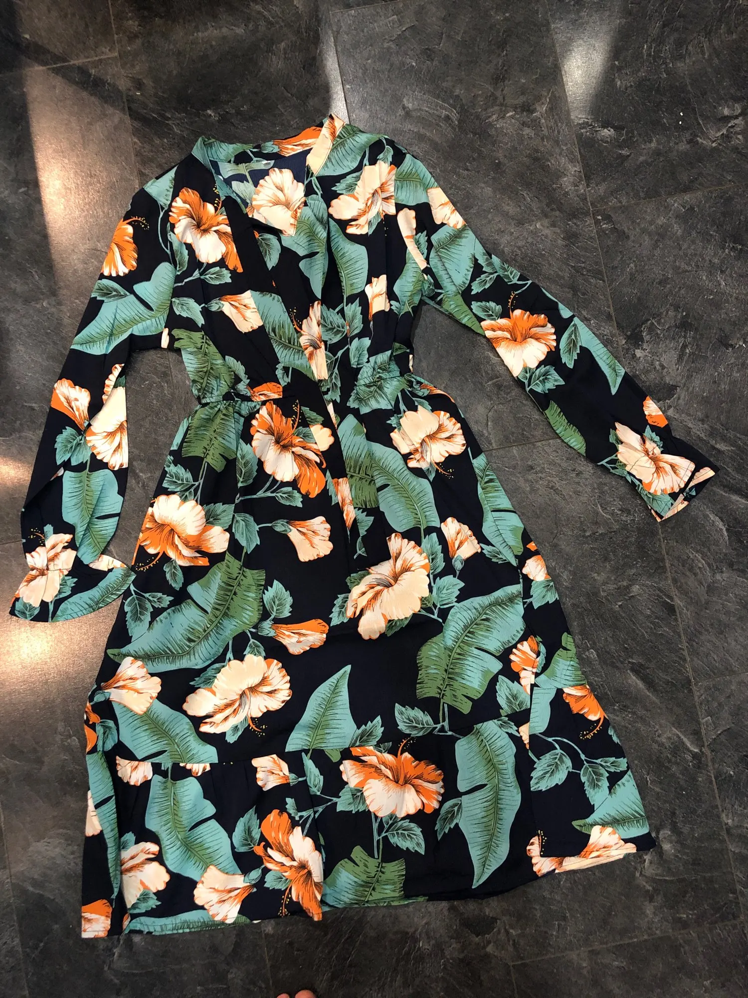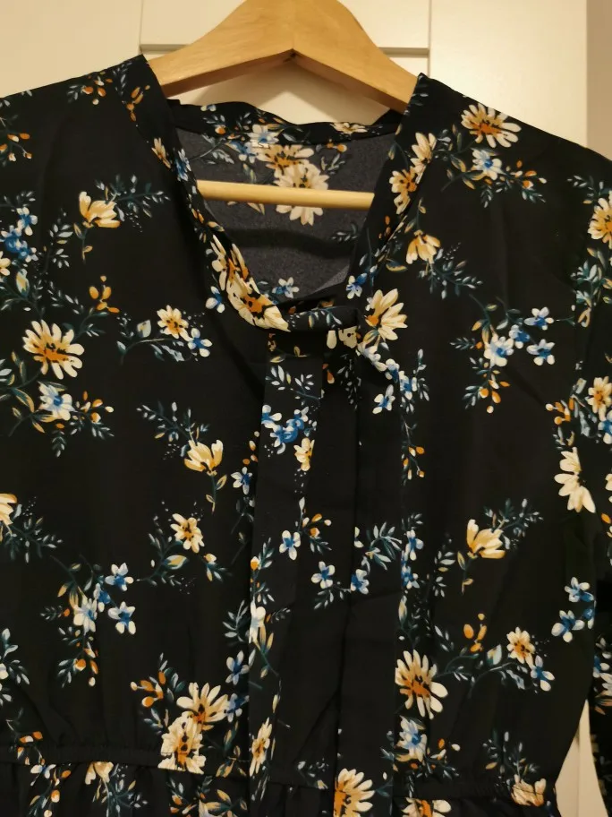 Милое платье. Мне очень понравилось. На рост 172,чуть ниже колена. Немного ошиблась с размером, взяла L, тк ранее брала другое платье размером xl и оно было достаточно свободным. Здесь другой крой, на 46-48xlбыл бы само то. В целом нареканий нет. Заказ пришёл за 2 недели.
