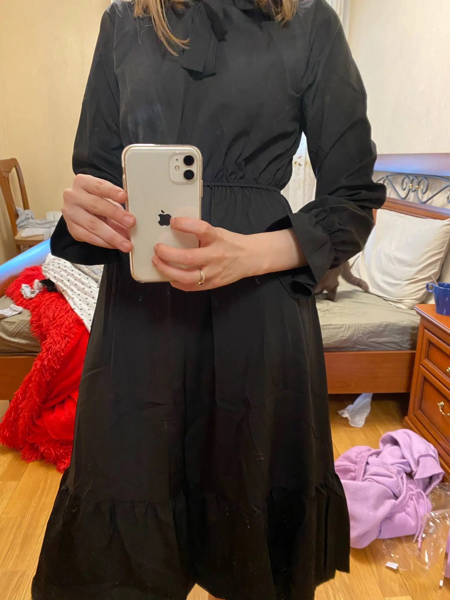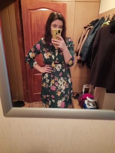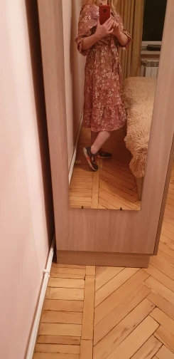 Скорость поставки средняя. На фото цвет спокойнее, в жизни оранжевый ярче и определенно не лучше. На рост 167 талия буквально под самой грудью, будто платье для беременных + рукава коротковаты. Не стала бы покупать, если бы знала, что вживую оно именно такого цвета и именно с такой высокой талией