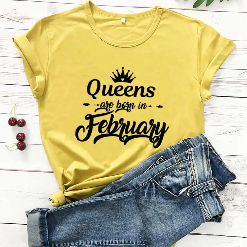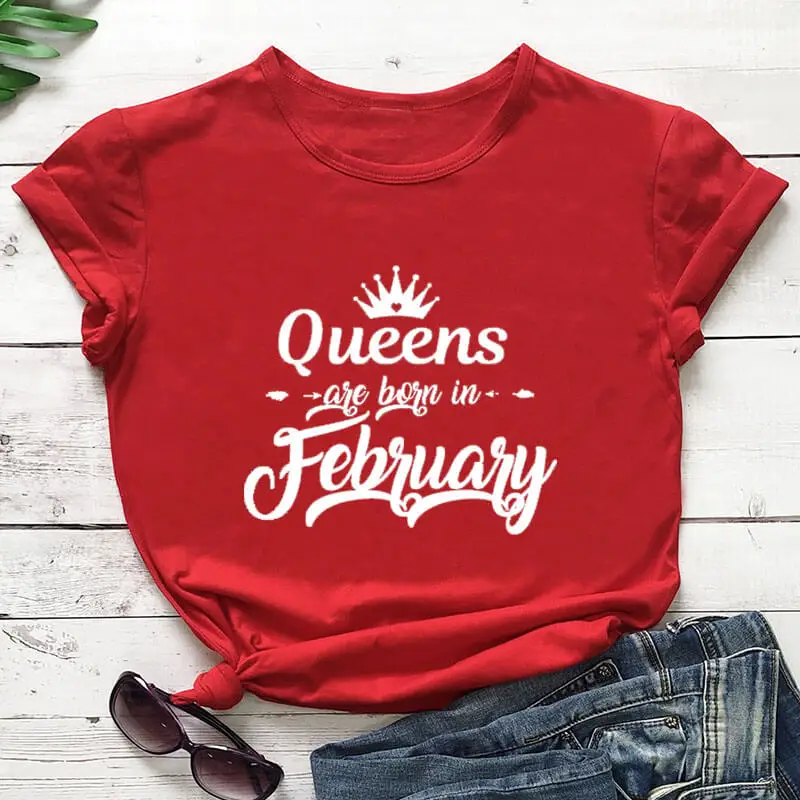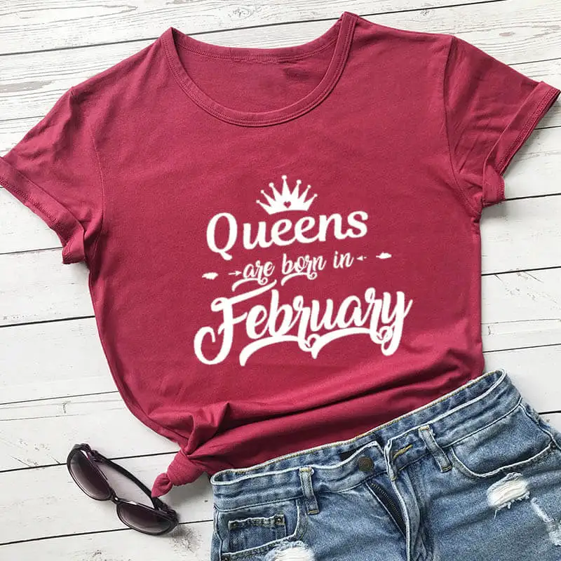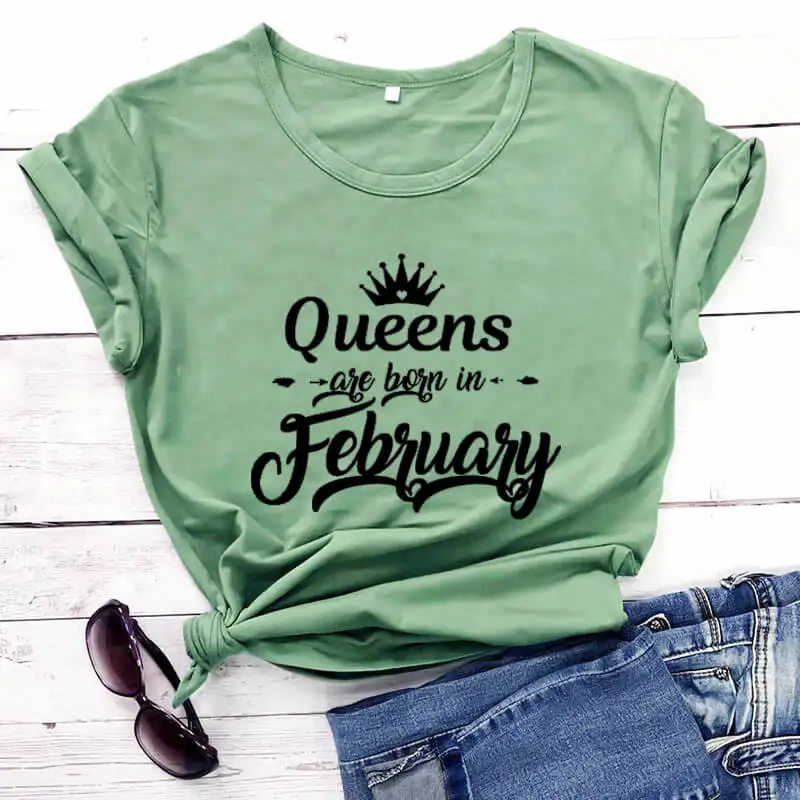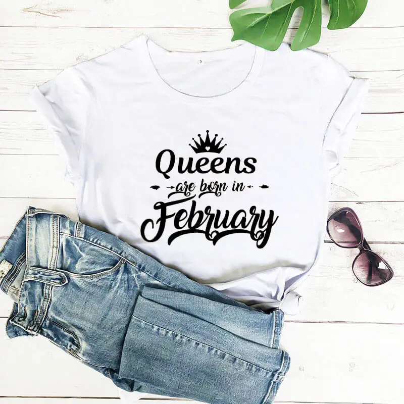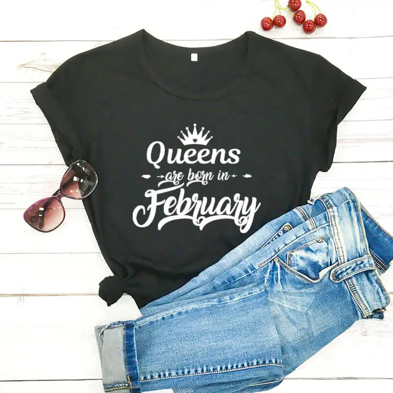 Футболка Queen s are born in Февраль, хлопковая, летняя, забавная, подарок на день рождения, для нее, футболка с королевой февраля