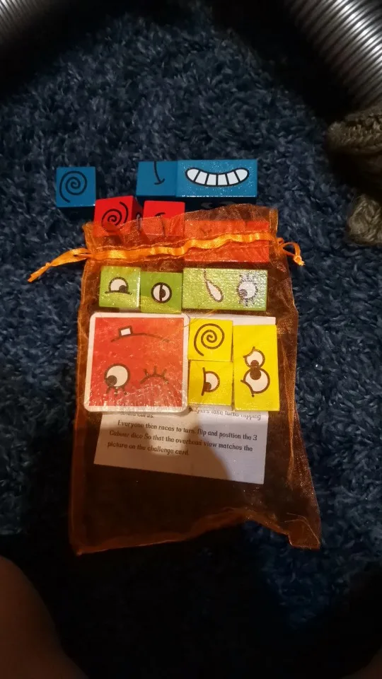 Цвета яркие, кубики хорошие, в некоторых местах есть небольшие царапины (только на красном кубике). Рисунки на кубиках нарисованы и будто лакированы сверху. К карточкам претензии нет. Коробка пришла без защиты, поэтому немного помялась по углам, но коробка очень плотная.