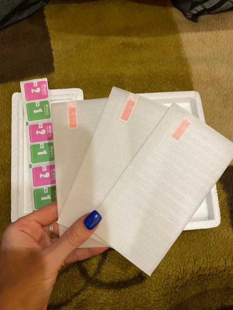 До Краснодара пришли за две недели. Все целое, три штуки как в описании. Но не на весь экран. В комплекте шли салфетки, правда без липучек, которые убирают с экрана пыль