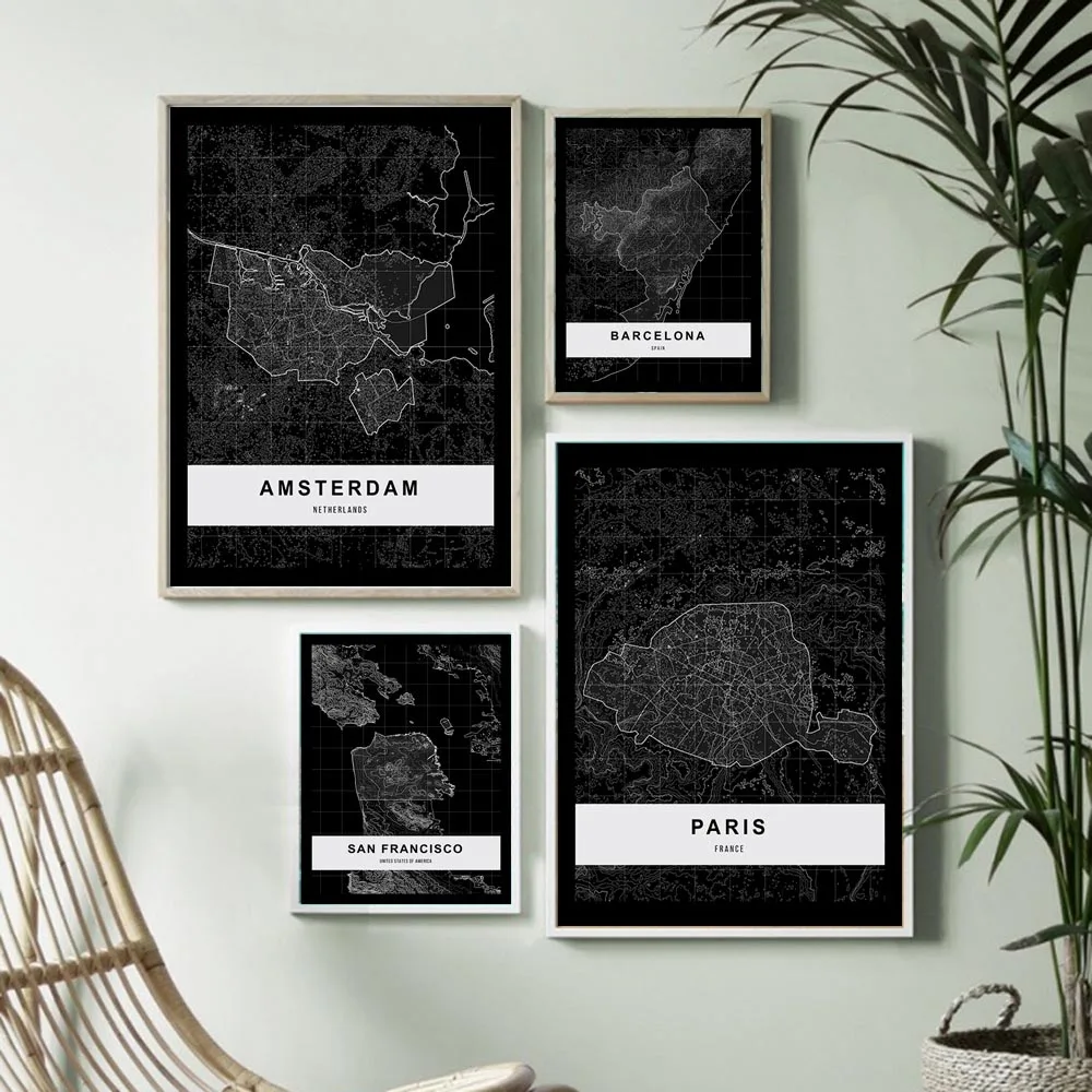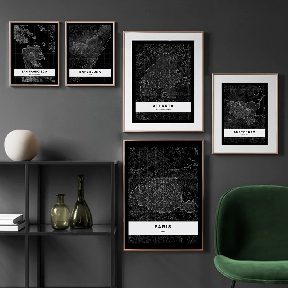 Черно-белая карта города, Атланта, Париж, скандинавские плакаты и принты, настенная живопись на холсте, настенные картины для гостиной, домашний декор