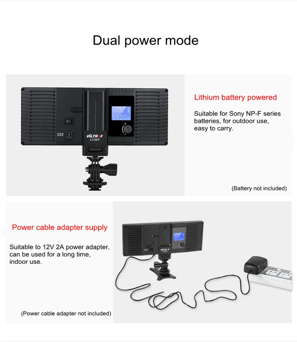 Характеристики: Бренд: Viltrox Модель: L132T светодиодный светильник Цветовая температура: 3300K ~ 5600K (можно регулировать) Диапазон яркости: 20% ~ 100% (можно регулировать) Максимальная яркость освещения: 0,5 лм/Люкс/м Мощность: 16,2 Вт Время светильник 2,2 ч (100% полный, NP-750 аккумулятор) Индекс цветопередачи: 95(RA) Входная мощность: литий-ионный аккумулятор NP-F550/F750/F960 sereis, 12 В/2 А, общий интерфейс DC005 Размеры: 255 мм x 100 мм x 30 мм Вес: прибл. 290 г Посылка 1 Светодиодный светильник L132T 1 х адаптер для горячего башмака 1 х Руководство пользователя Примечание: камера и аккумулятор в комплект не входят!