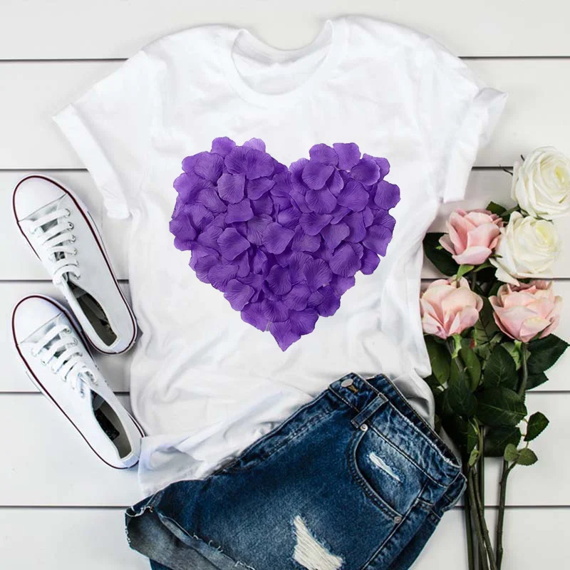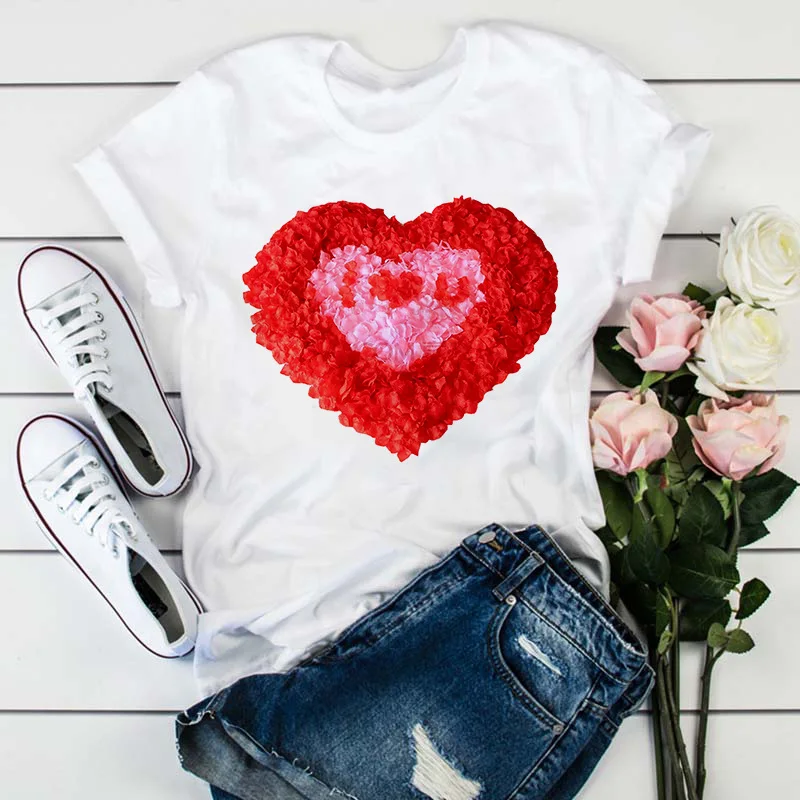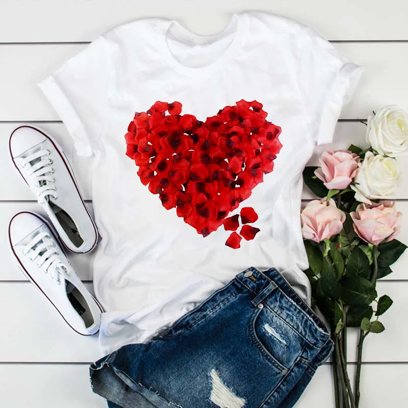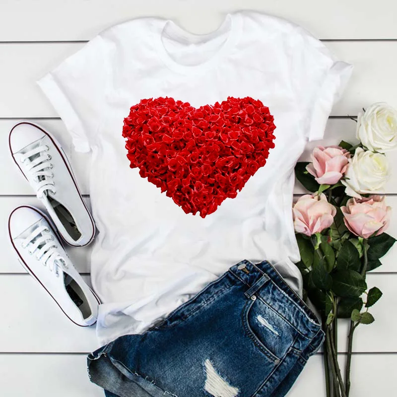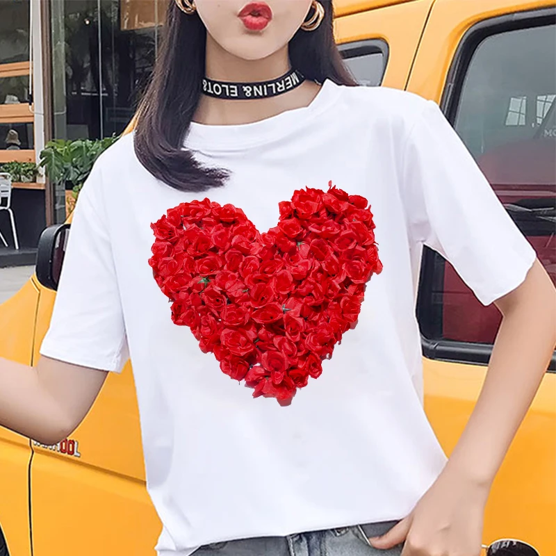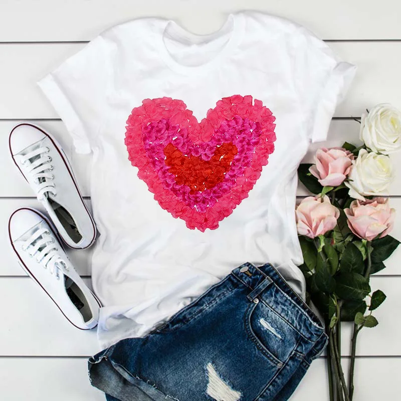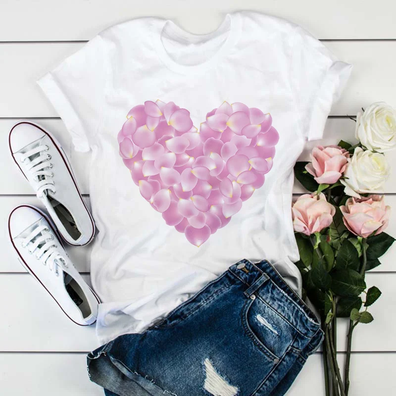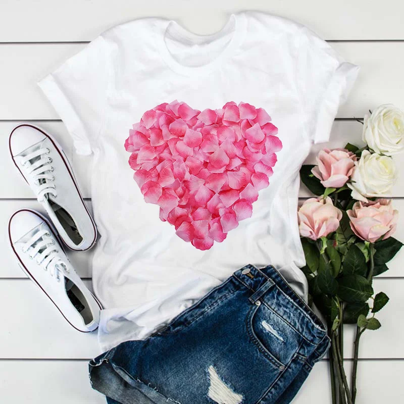 Модная женская футболка с принтом в виде розовых лепестков сердца, Летняя Повседневная белая футболка с коротким рукавом, Топ в стиле Харадзюку, уличная одежда, женская футболка