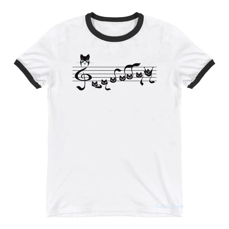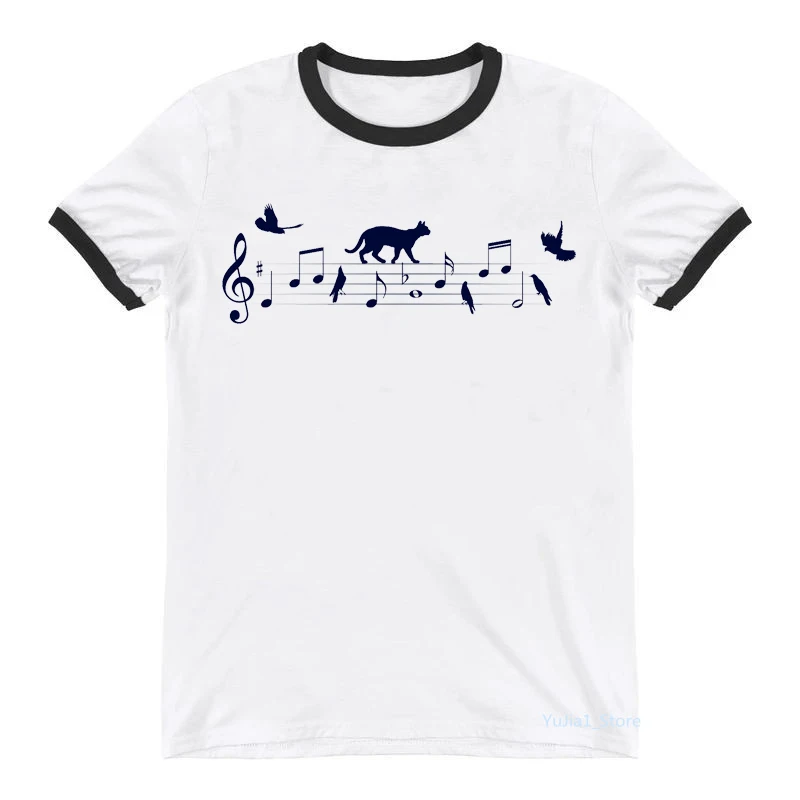 Новинка, Забавные футболки с принтом музыкальных нот с черной кошкой, птицами и животными, женский летний топ, женская футболка, футболки с кольцом, Милая футболка