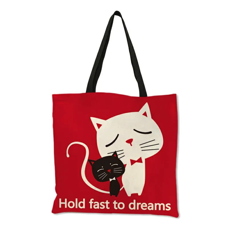 Сумка-тоут женская льняная, многоразовая, с принтом кошки, 2019