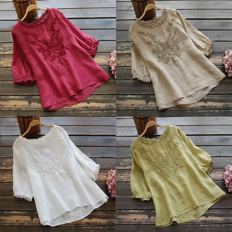 Блузка для женщин размера плюс с оборками из хлопка, женская блузка с вышивкой, летняя рубашка с пышными рукавами, Повседневная