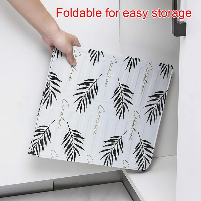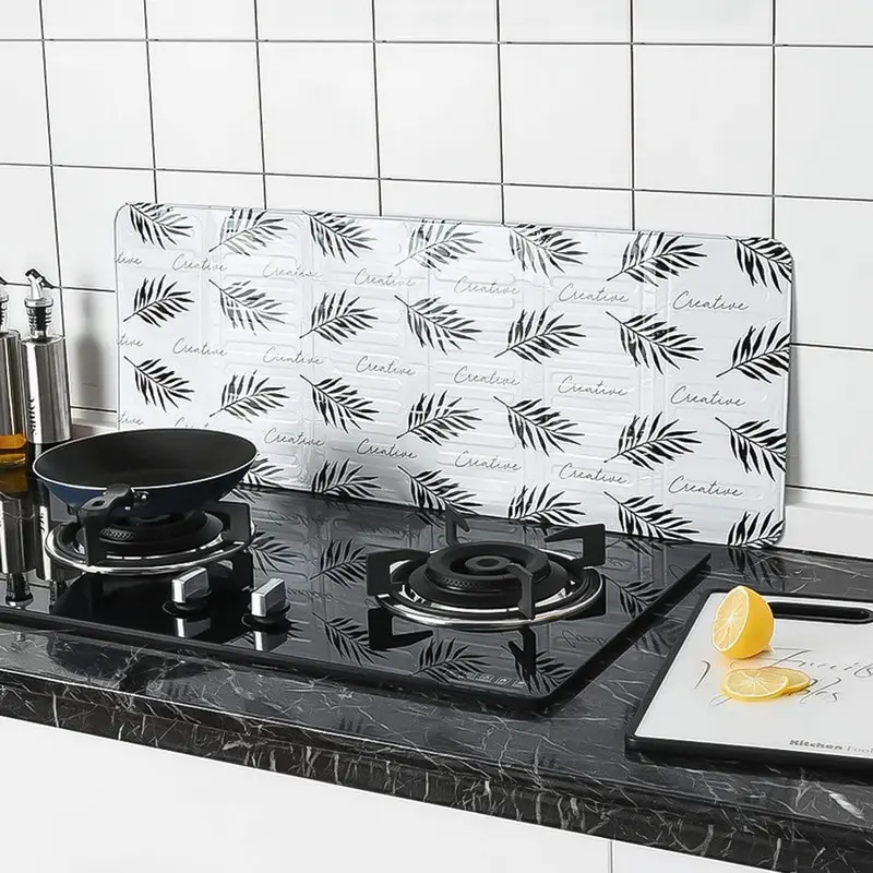 Size: 845*325*0.8mmColor: white/blackMaterial: aluminium foilFeatures:1.The Non-stick splatter shield keeps cooking surfaces, counters, walls and floors free from grease splatters!2.Three hinged panels unfold and surround your pans and skillets to provide a tall,protective barrier against hot, harmful grease.3.Non-stick surface is easy to clean and makes kitchen clean-up a breeze!4.Folds flat to store when not in use.5.The splatter screen helps eliminate burns, messy clean-up and ideal for protecting walls while using a mixer bowl.6.The convenient shield has three hinged panels that adjust to fit any size burner or pan.Package Included:1 pcs Kitchen Oil Splash Guard