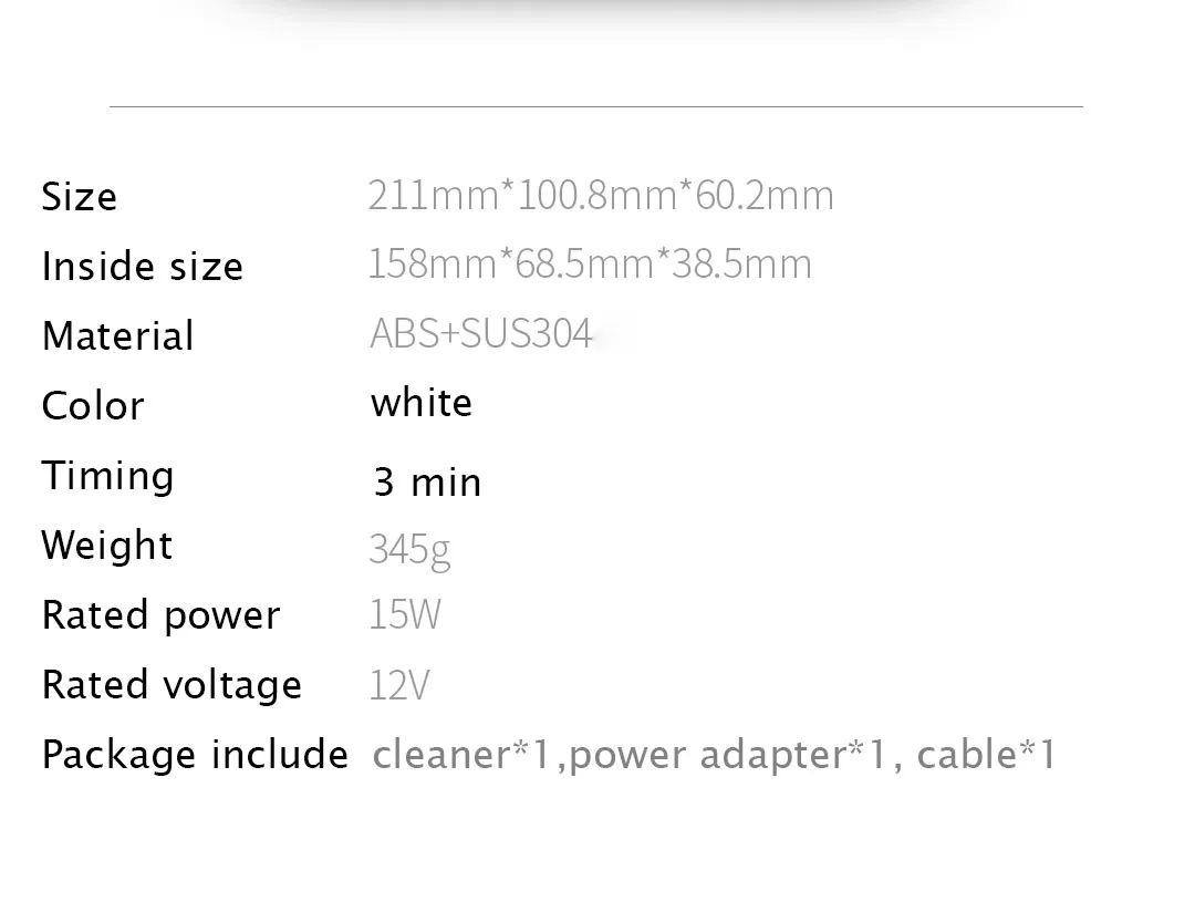 В наличии! Это продукт xiaomi chainlink, на котором нет логотипа xiaomi или mi, спасибо. Не используйте эту машину для очистки мягких боевых ювелирных изделий, например, жемчуга Информация о продукции: Размер изделия: 211 мм * 100,8 мм * 60,2 мм Внутренний размер: 158 мм * 68,5 мм * 38,5 мм Материал: АБС + нержавеющая сталь sus304. Время: 3 минуты Вес: 345 г Номинальная мощность: 15 Вт Номинальное напряжение: 12 В Посылка включает в себя: Китайское руководство * 1 Адаптер питания * 1 Сертификат * 1