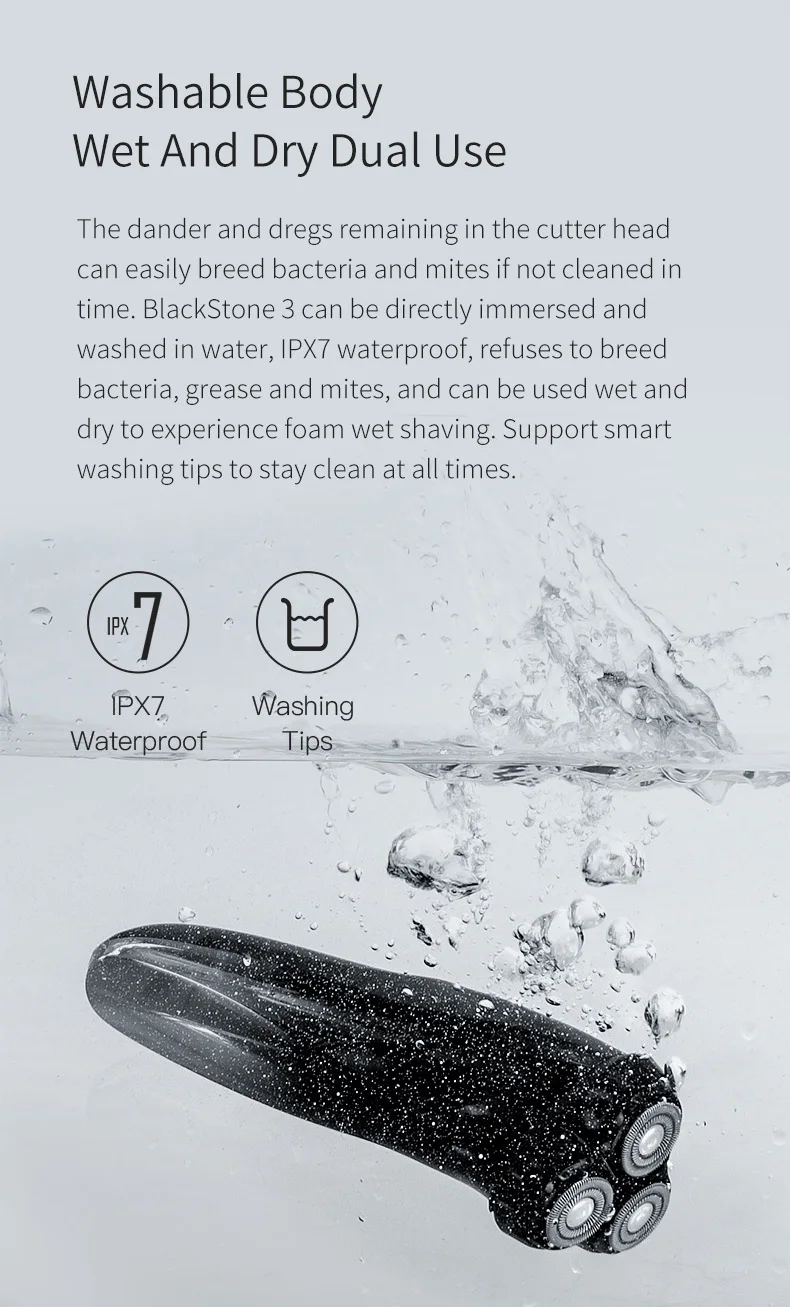Оставшиеся в режущей головке перья и стружки могут легко размножать бактерии и клещей, если они не будут своевременно очищены. BlackStone 3 можно непосредственно погружать и мыть в воду, IPX7 водонепроницаемый, отказывается размножать бактерии, жир и клещей, а также может использоваться влажным и сухим для влажного бритья пеной. Поддерживает умные советы по стирке, чтобы всегда оставаться чистым.