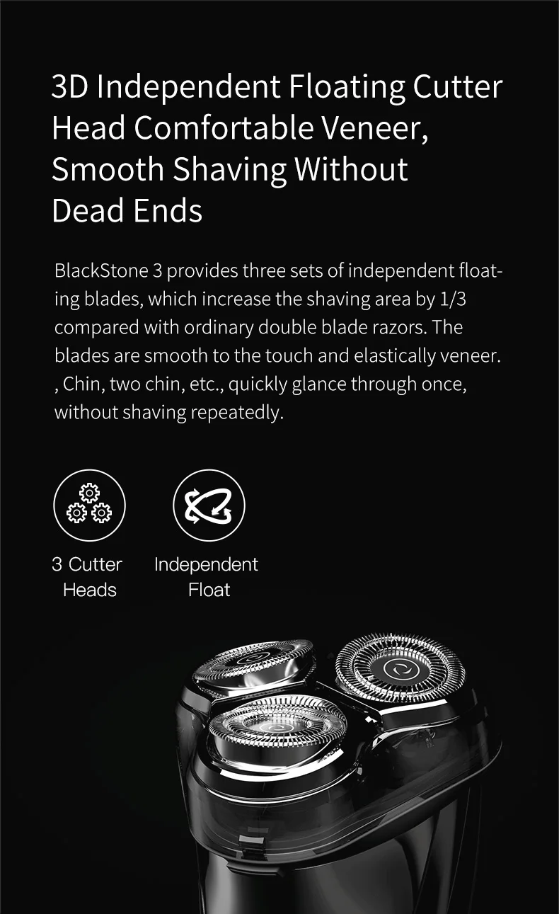 Удобный шпон, гладкое бритье без тупиковBlackStone 3 предоставляет три набора независимых плавающих лезвий, которые увеличивают площадь бритья на 1/3 по сравнению с обычными двойными лезвия для бритвы. Лезвия гладкие на ощупь и эластичный шпон., Подбородок, два подбородка и т. Д., быстро просмотрите один раз, без повторного бритья.● 3 режущие головки● Независимый поплавок