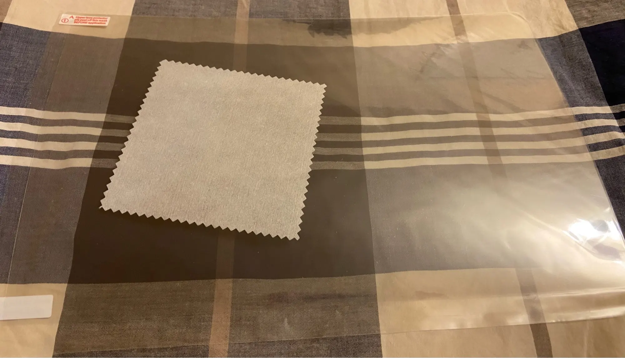 Плёнка пришла просто с тряпкой для протирания, вспомогательных стикеров, влажной и сухой салфетки не было. Сама плёнка в некоторых местах была помята. Даже с учетом того, что у меня были в запасе влажные и сухие салфетки, стикеры военка в месте изгиба отклеивалась, я ее отклеил и выкинул в мусорник