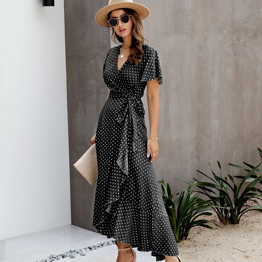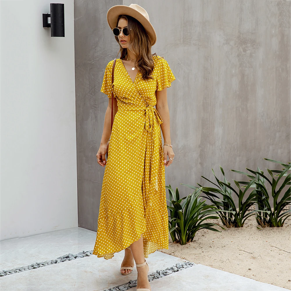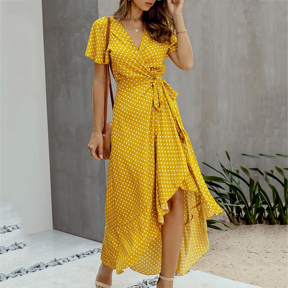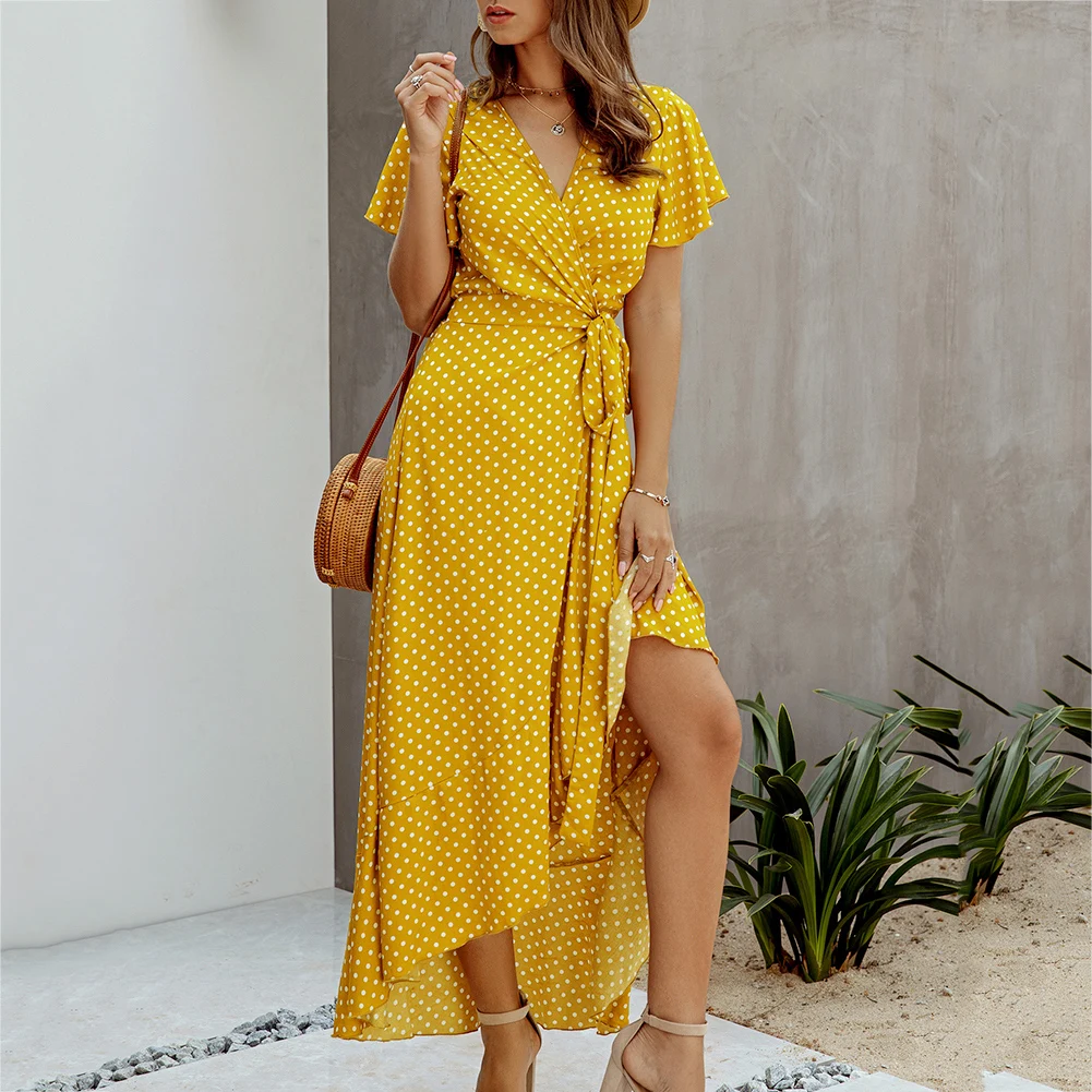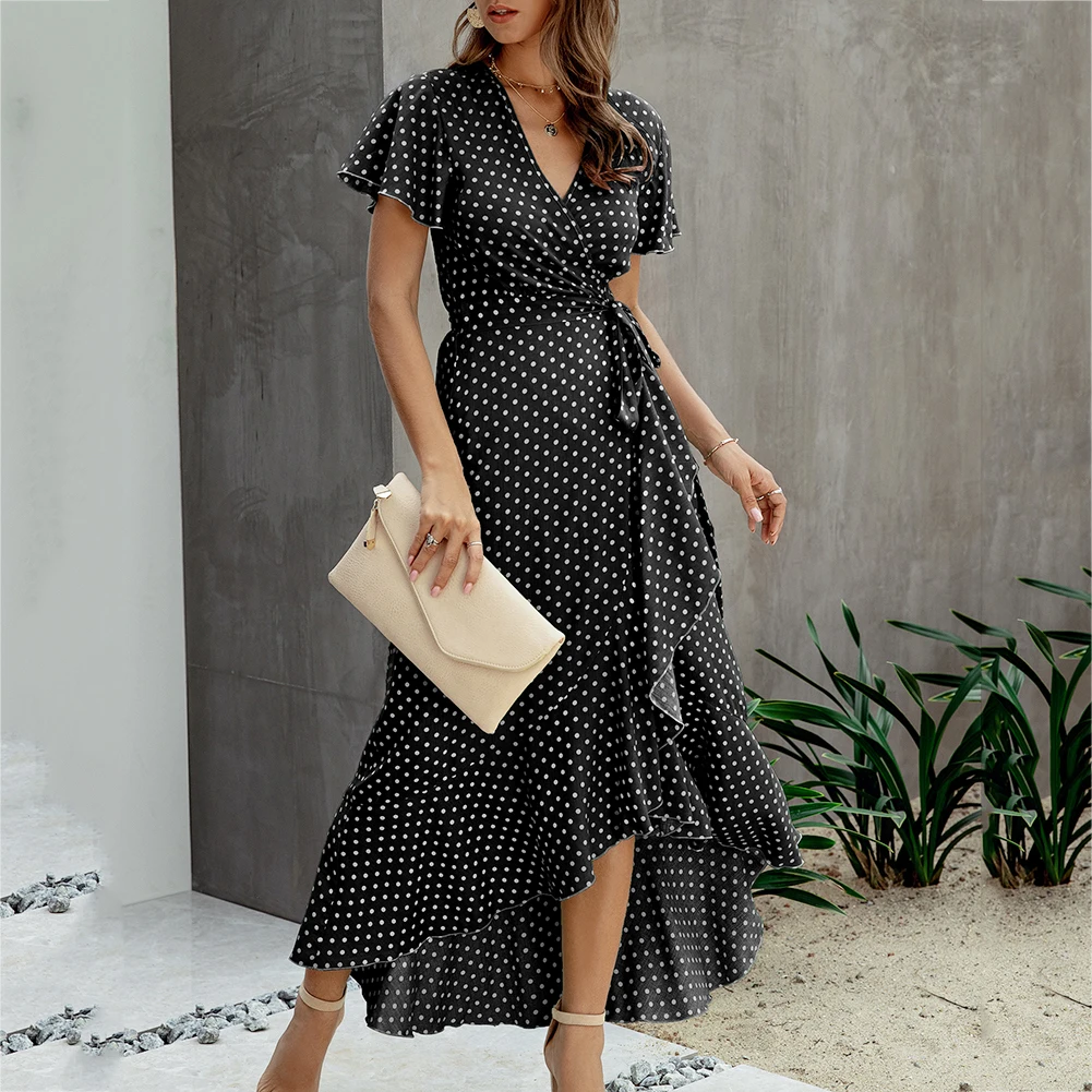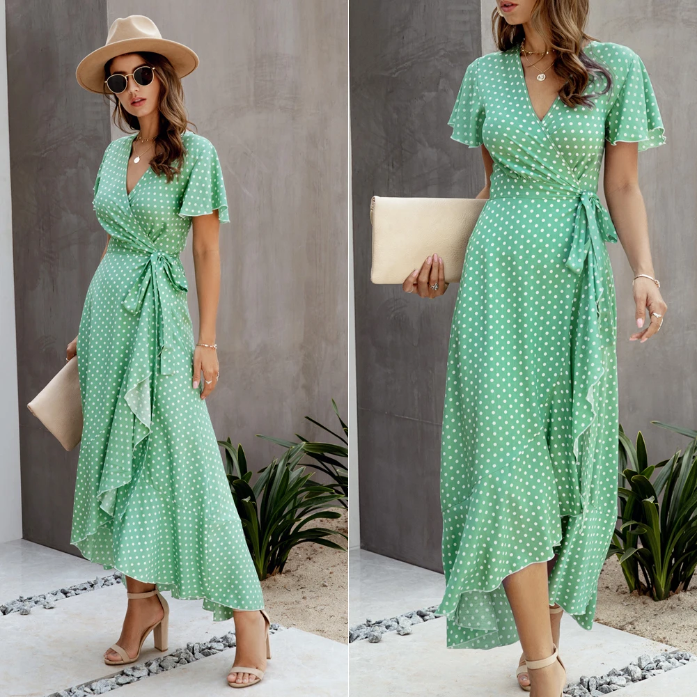 Модное женское длинное платье с v-образным вырезом, коротким рукавом и принтом в горошек, гофрированным подолом и поясом