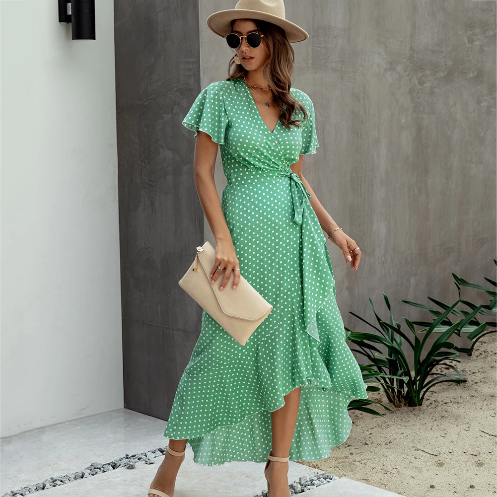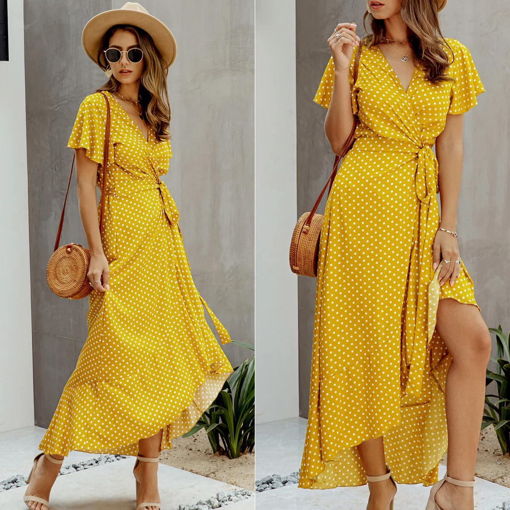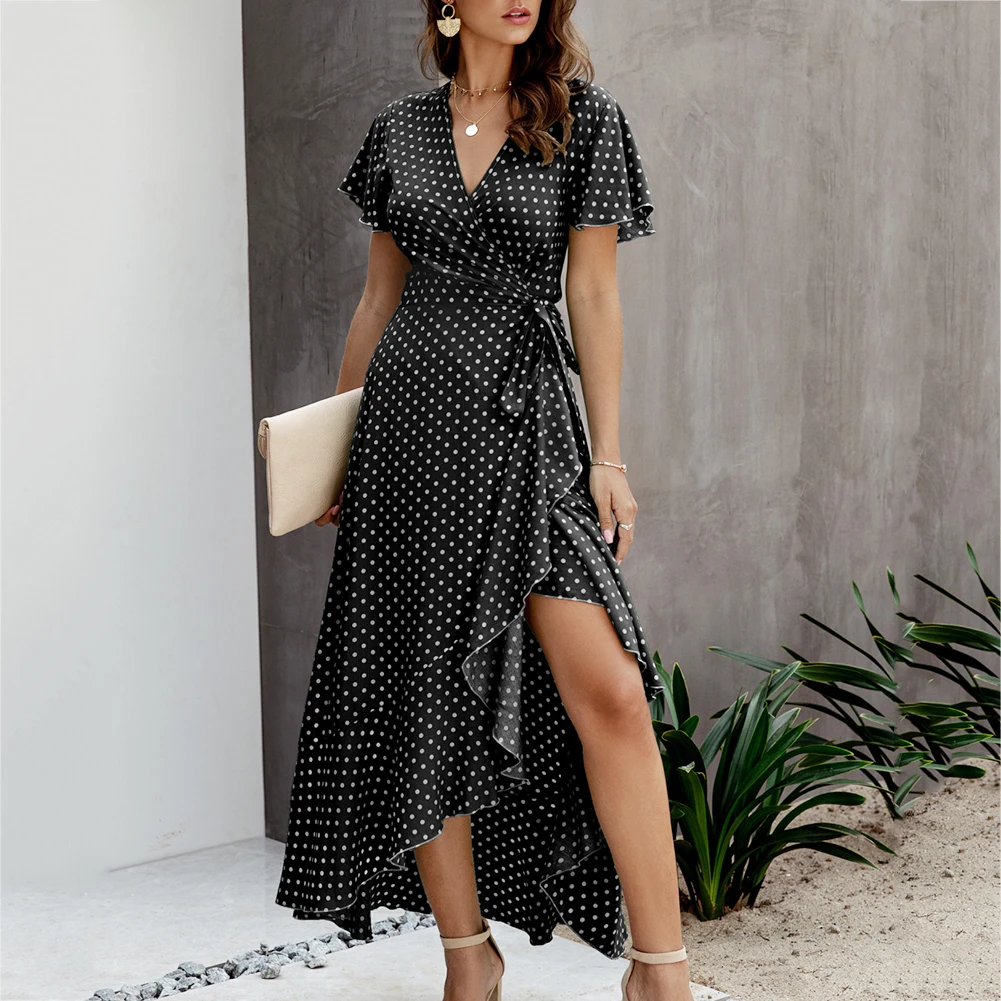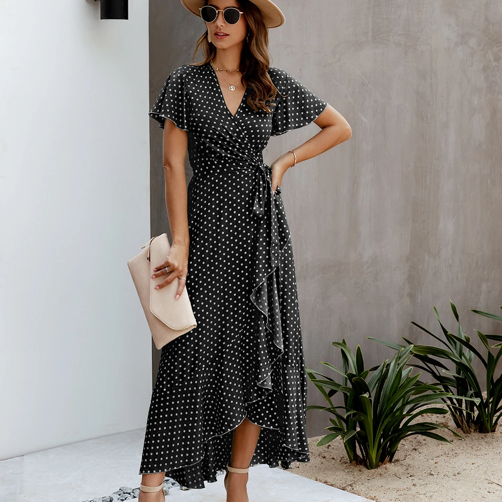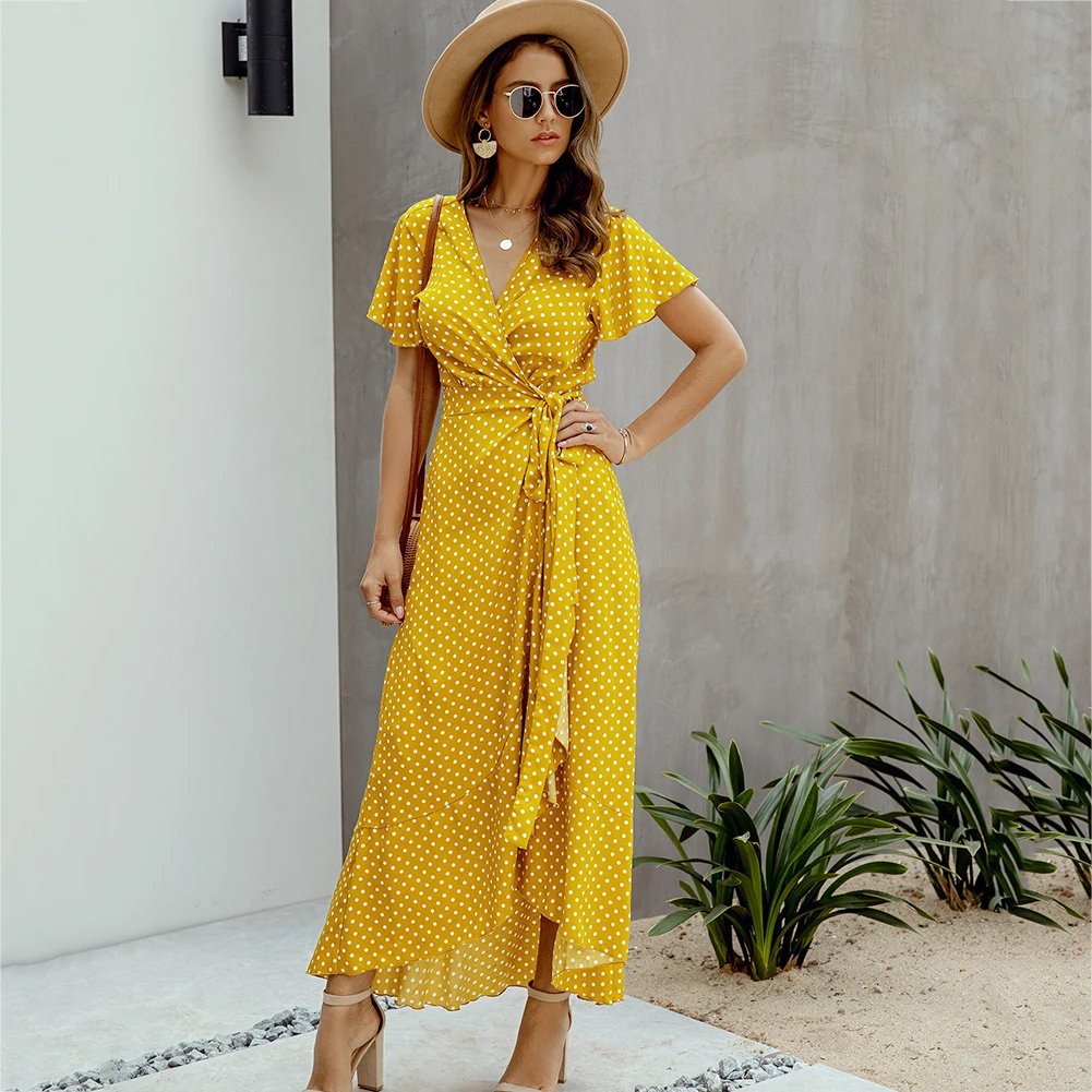 Модное женское длинное платье с v-образным вырезом, коротким рукавом и принтом в горошек, гофрированным подолом и поясом