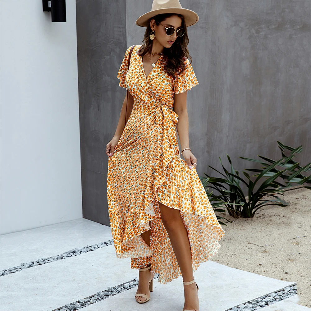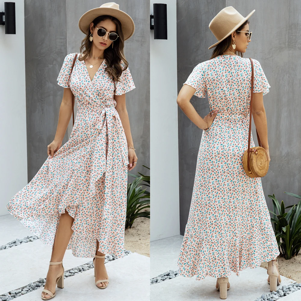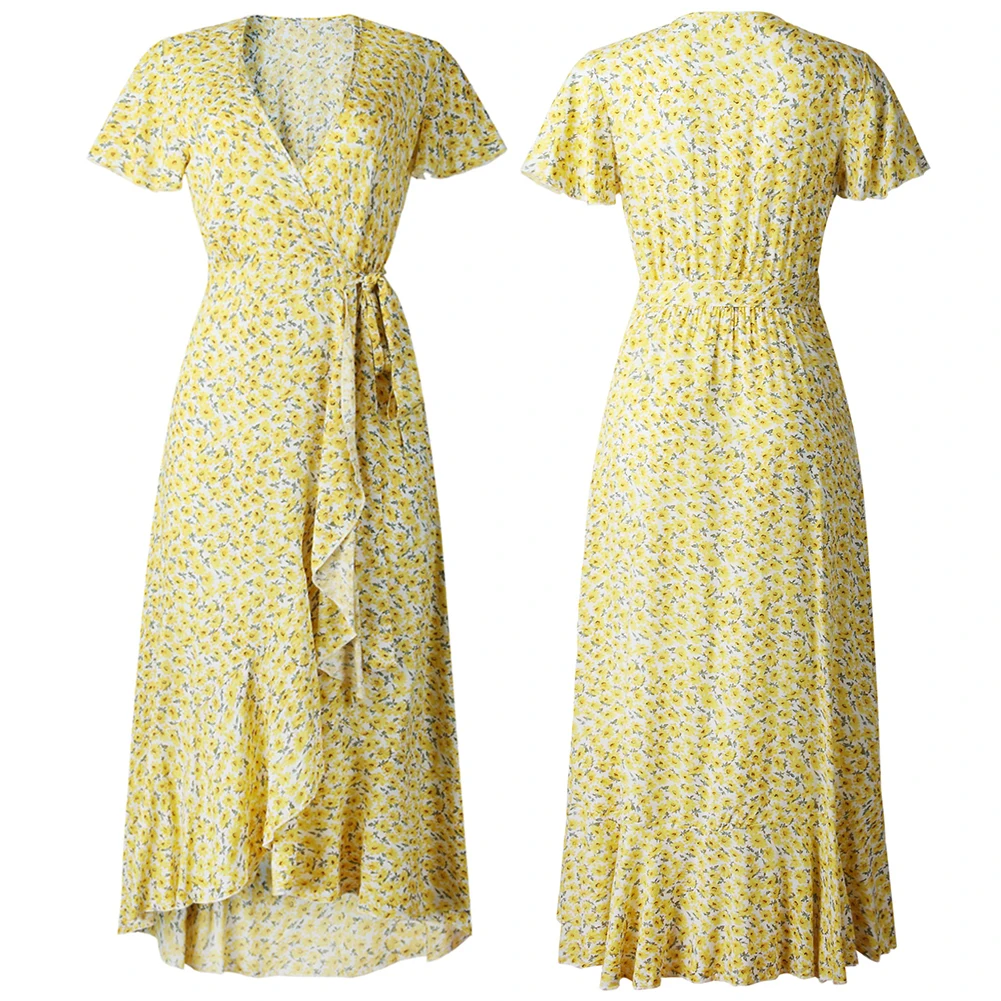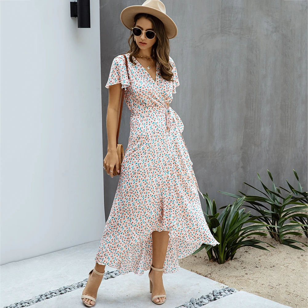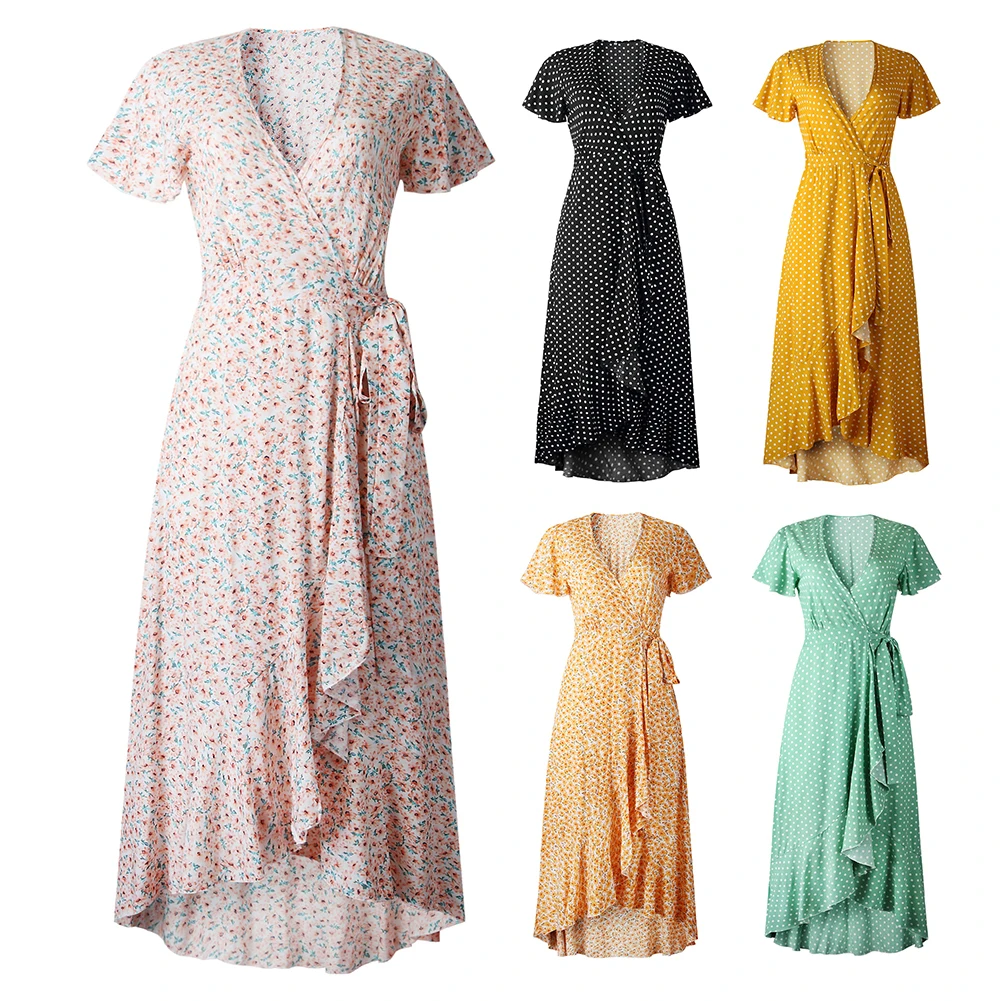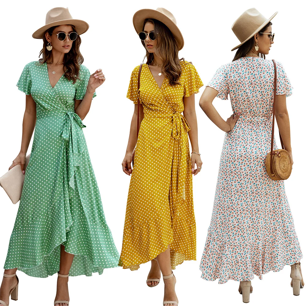 Модное женское длинное платье с v-образным вырезом, коротким рукавом и принтом в горошек, гофрированным подолом и поясом