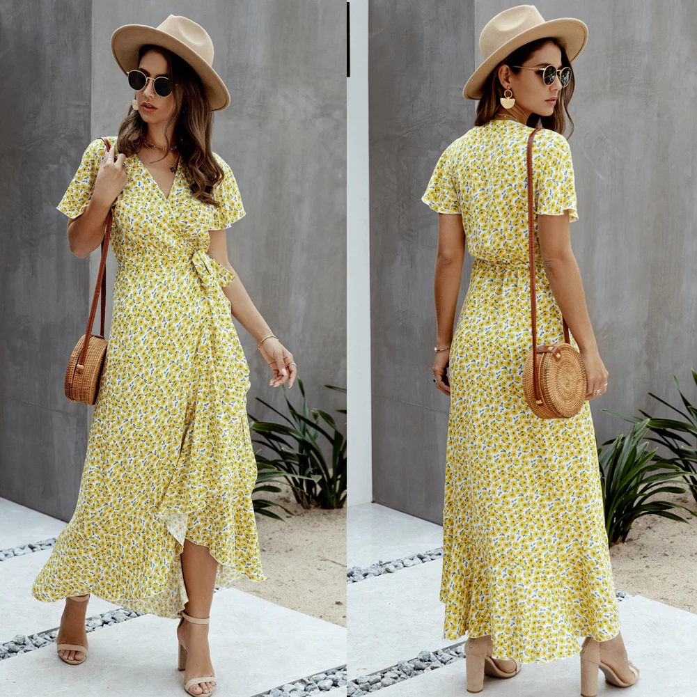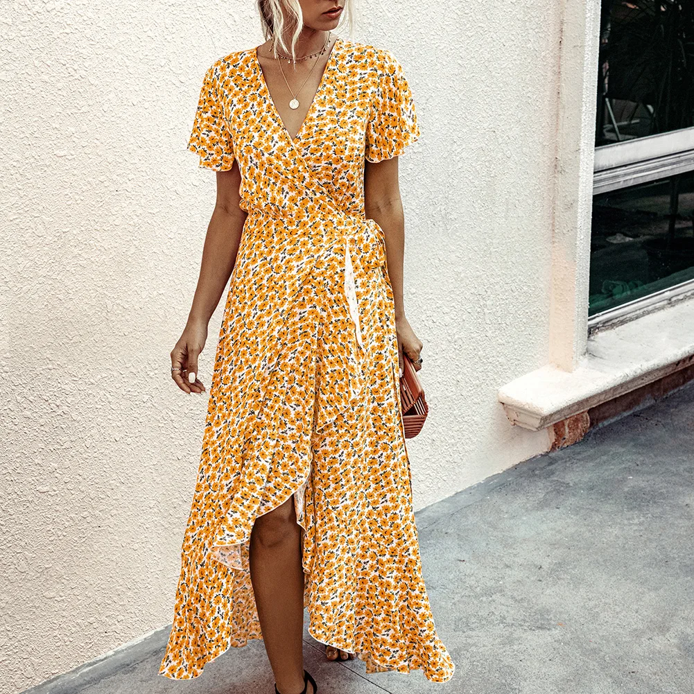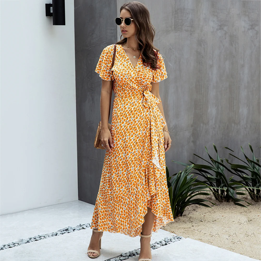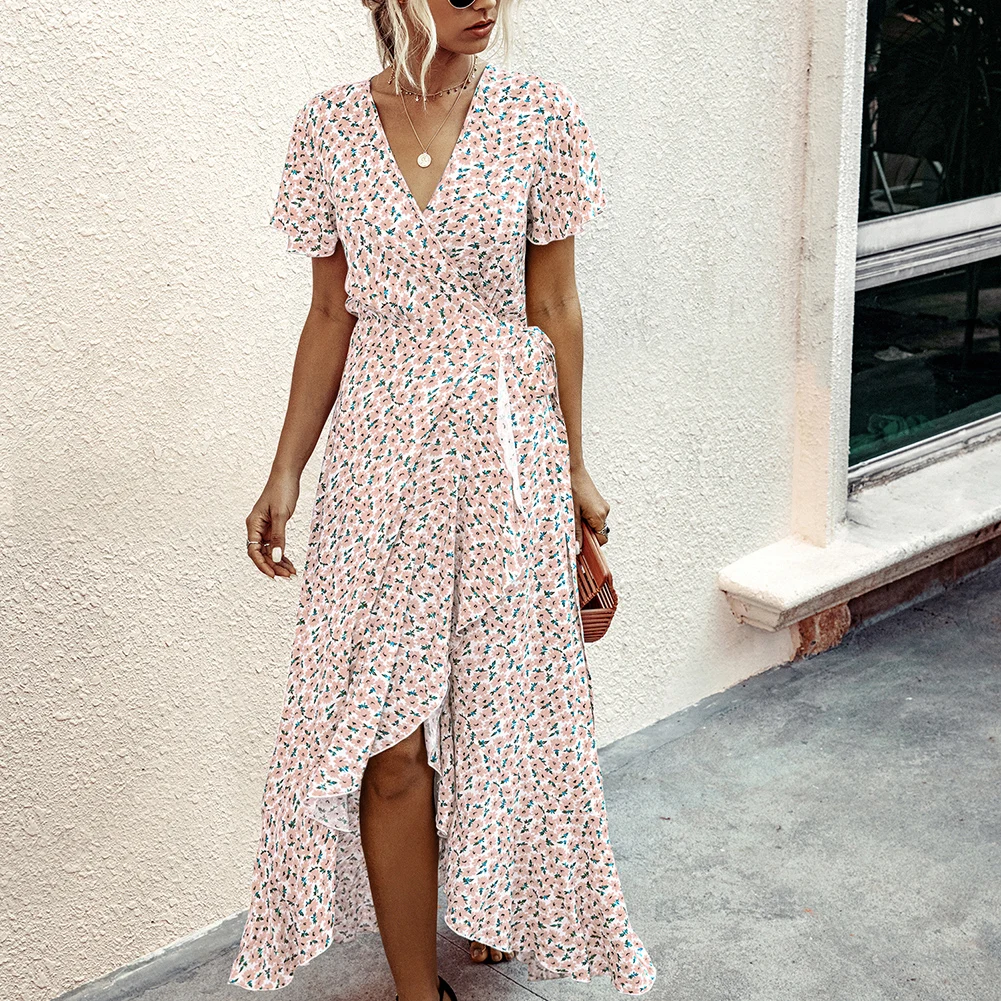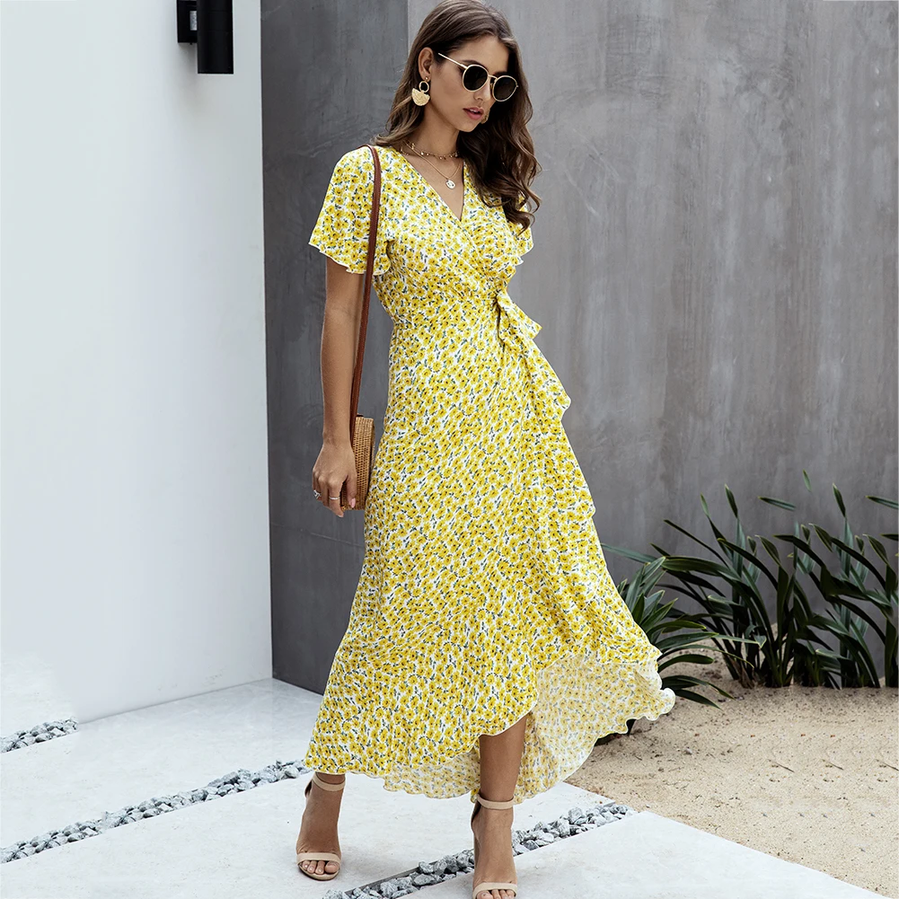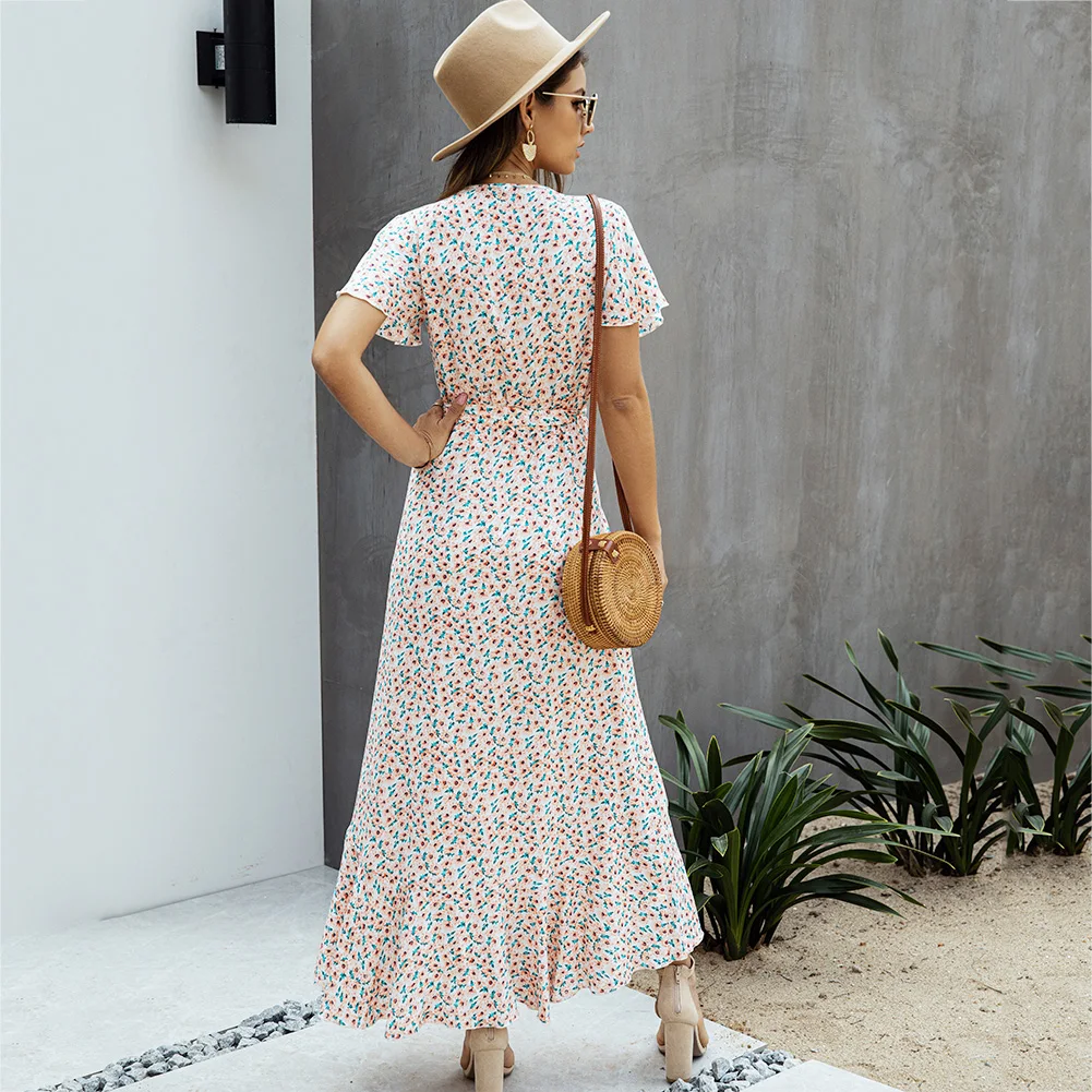 Модное женское длинное платье с v-образным вырезом, коротким рукавом и принтом в горошек, гофрированным подолом и поясом