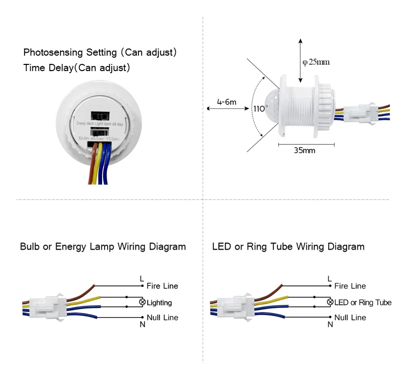 Инфракрасный датчик движения из PIR переключателяМатериал: ПВХ Цвет: белыйРабочее напряжение: 100-240 В мощность нагрузки: <= 40 ВтРабочая температура: -10 ℃ -+ 40 ℃Время задержки: 40sУправление светильник: >= 3 люксУгол индукции: 110 градусовИндукционное расстояние: 4-6 м в режиме ожиданияПотребеление энергии: менее 0,1 wПрименение: светодиодный светильник, светодиодный светильник, потолочный светильник, энергосберегающая лампа, люминесцентная лампа.