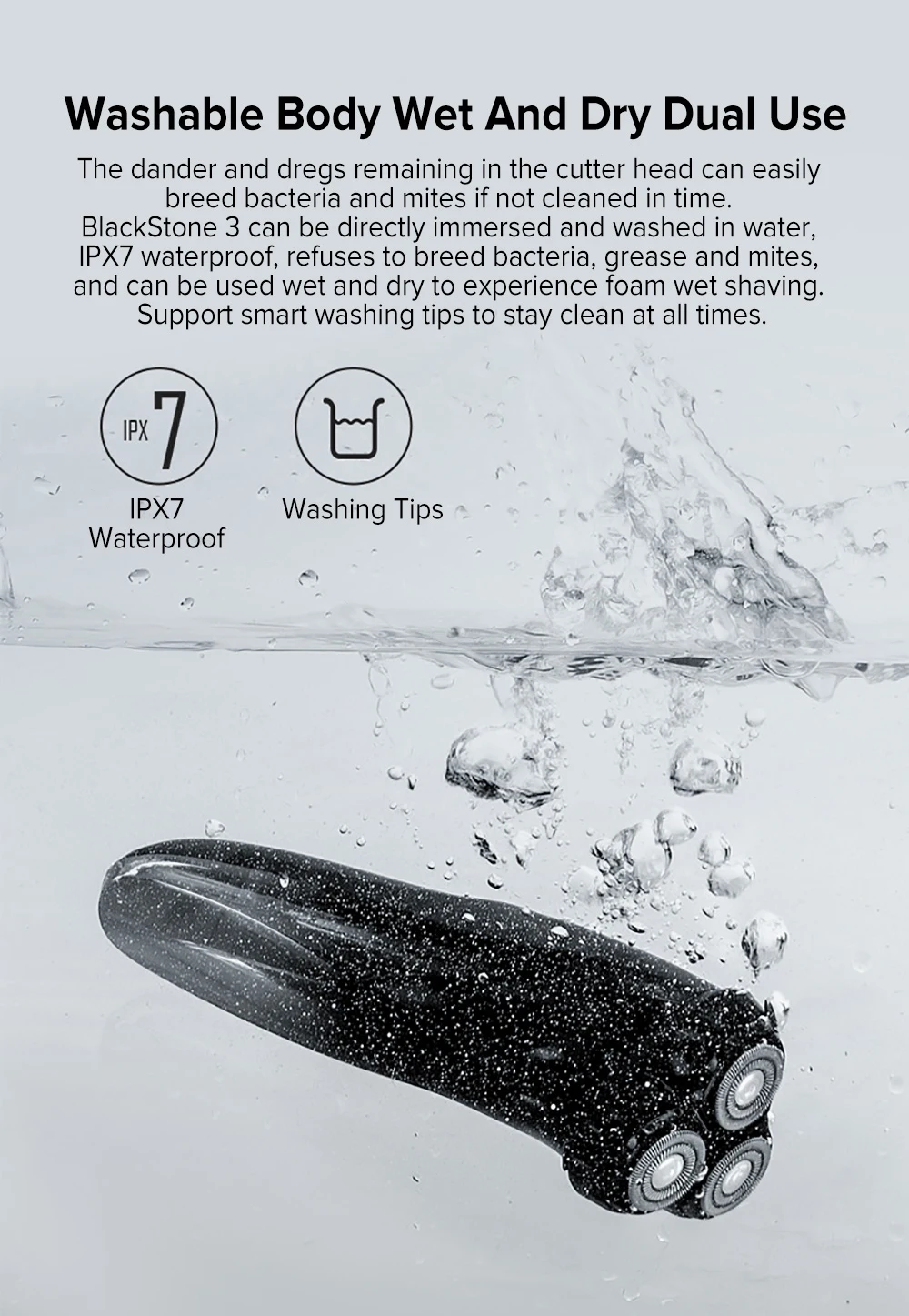 BlackStone 3 можно непосредственно погружать и мыть в воду, IPX7 водонепроницаемый, отказывается размножать бактерии, жир и клещей, а также может использоваться влажным и сухим для влажного бритья пеной.