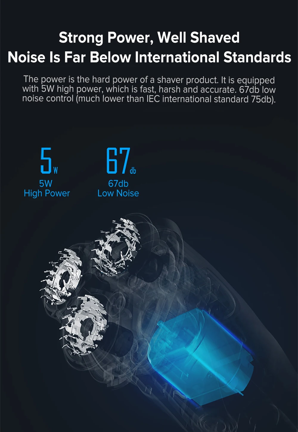 Мощность-это Твердая сила бритвы. Он оснащен высокой мощностью 5 Вт, что делает его быстрым, жестким и точным. 67 дБ низкий уровень шума (намного ниже, чем Международный стандарт IEC 75 дБ), обеспечивая пользователям комфортное бритье.