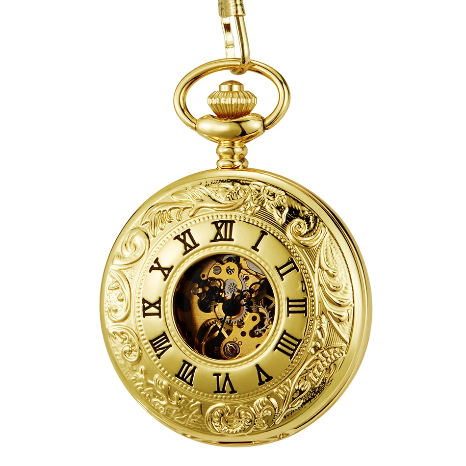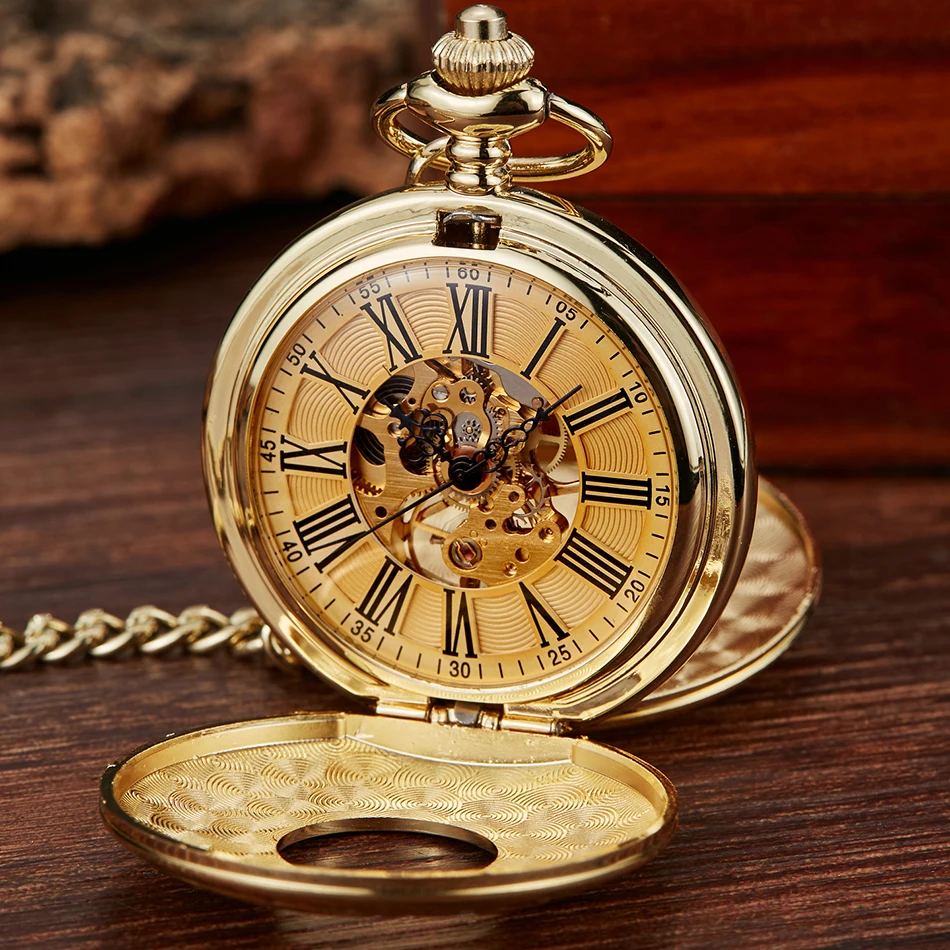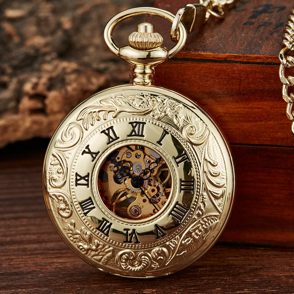 Золотистые Механические карманные часы, двойной чехол, цепочка для часов, скелетоны, цветок в стиле стимпанк, часы с резьбой по дереву кулон