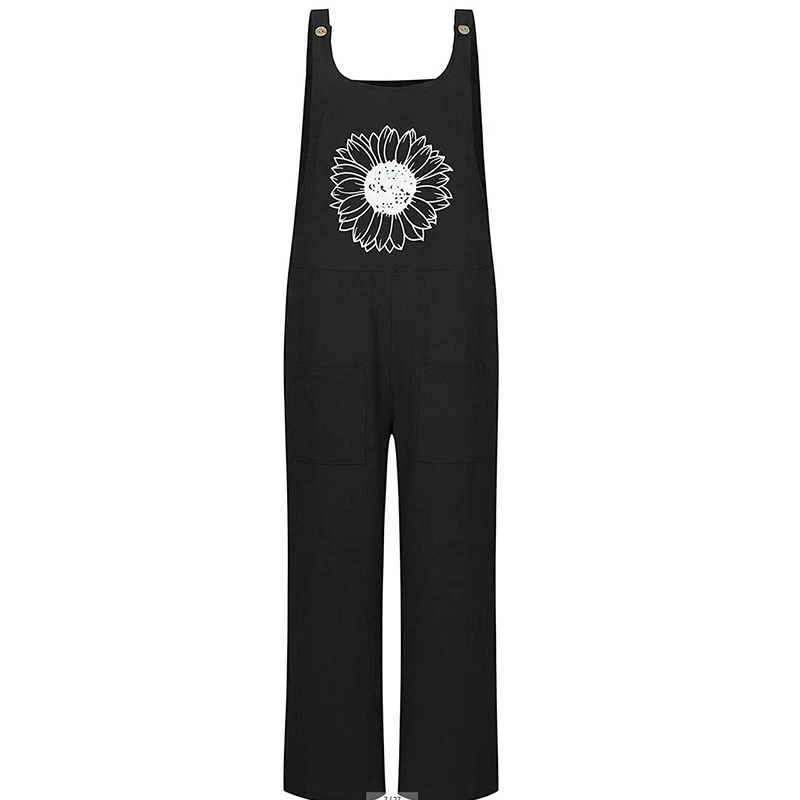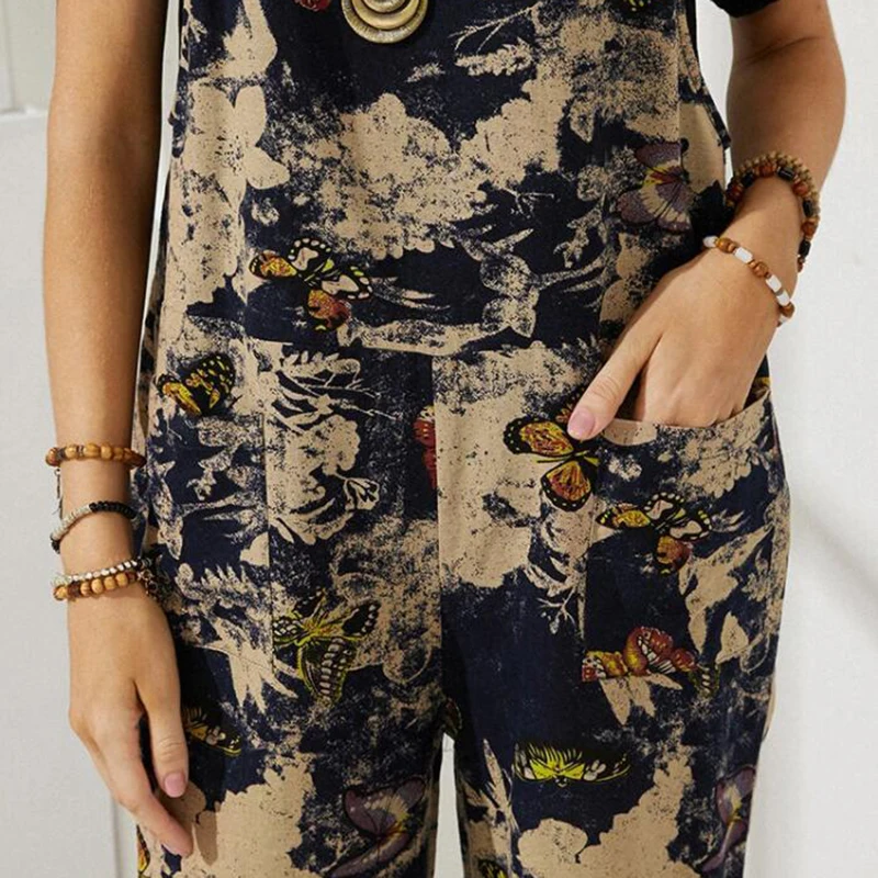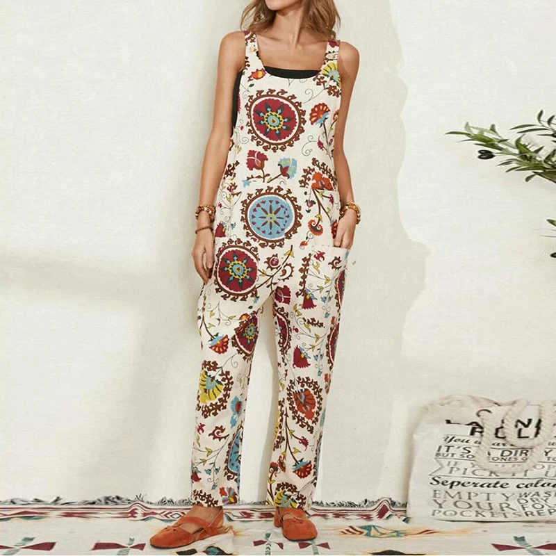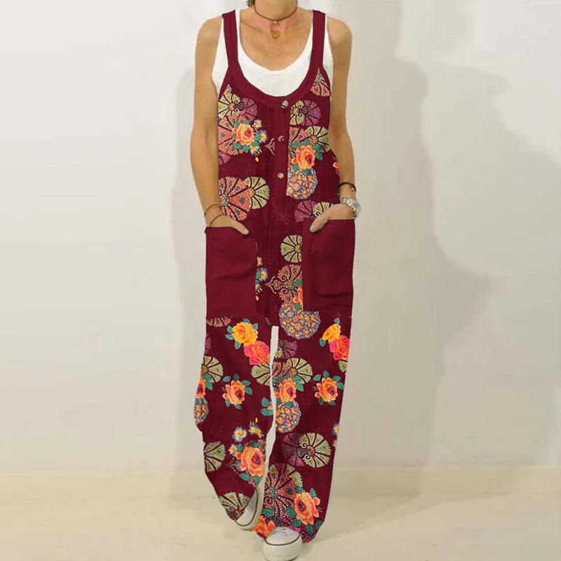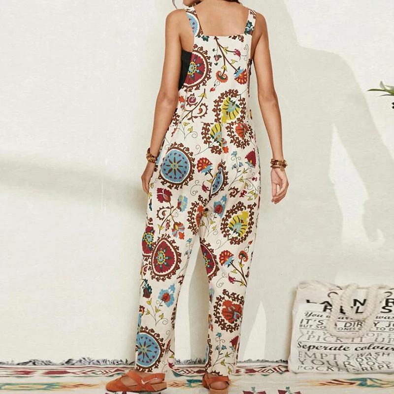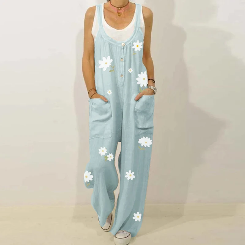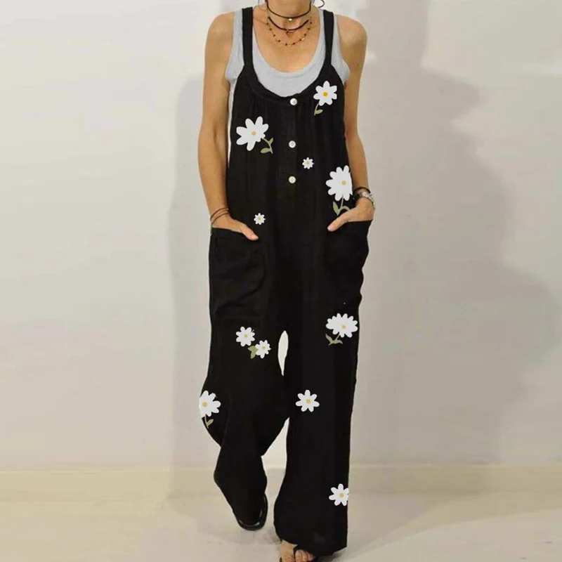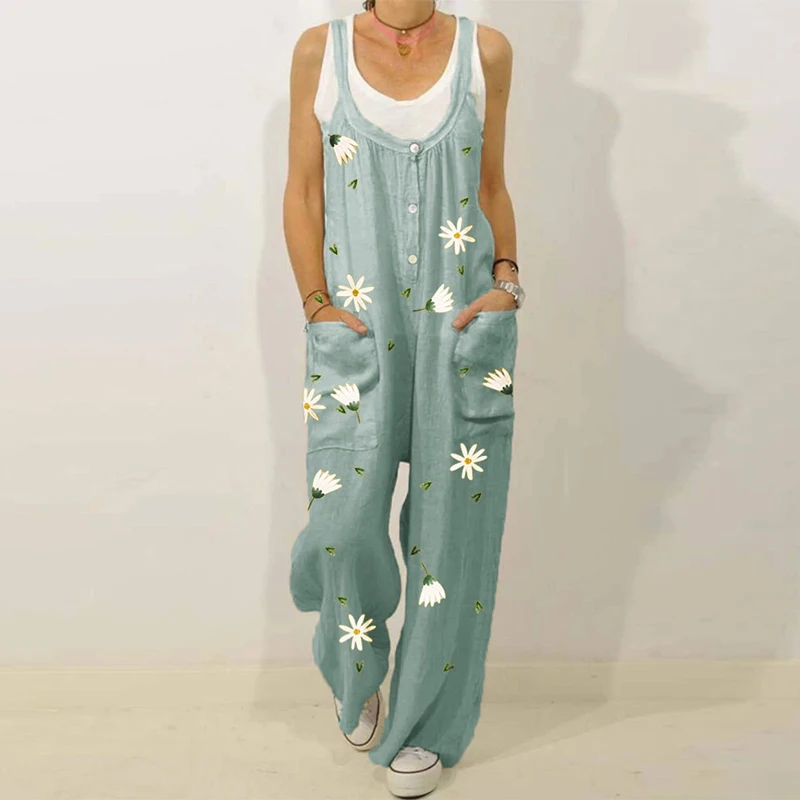 Женский свободный комбинезон из хлопка и льна, боди на пуговицах с цветочным принтом, элегантный комбинезон с открытой спиной, карманами и широкими штанинами, лето 2020