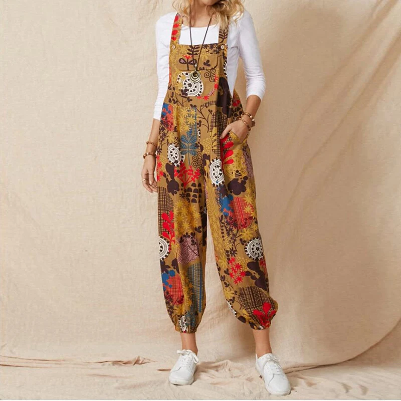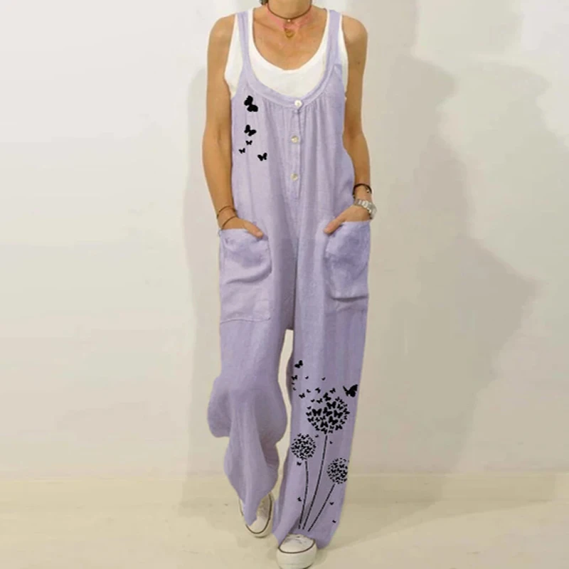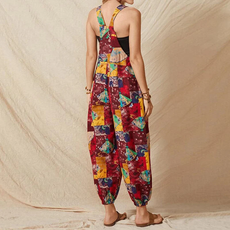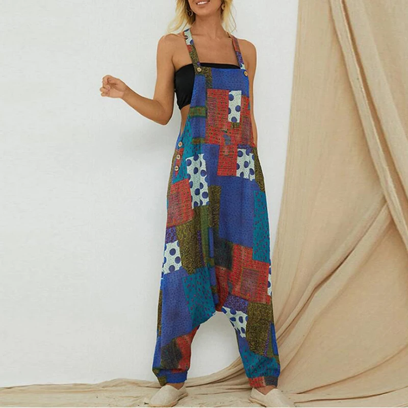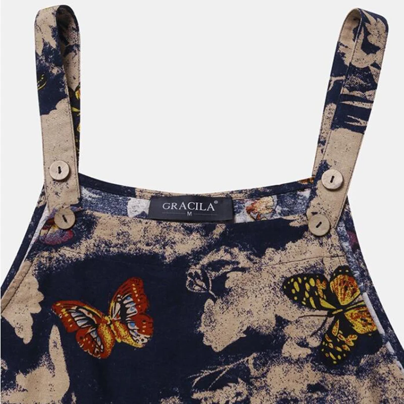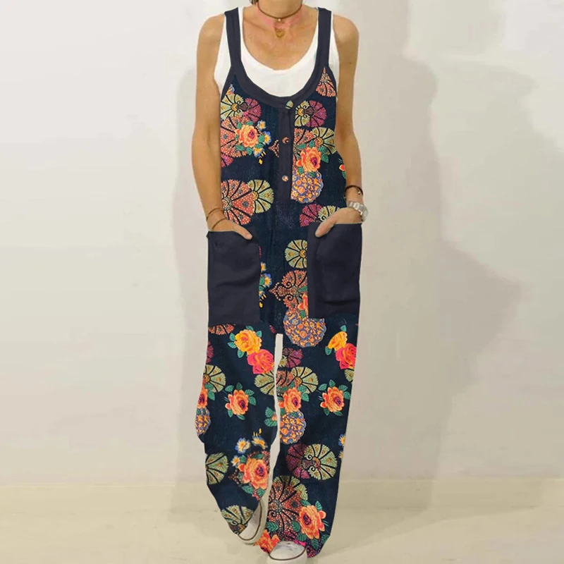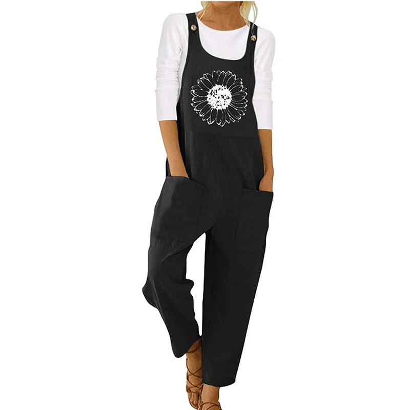 Женский свободный комбинезон из хлопка и льна, боди на пуговицах с цветочным принтом, элегантный комбинезон с открытой спиной, карманами и широкими штанинами, лето 2020