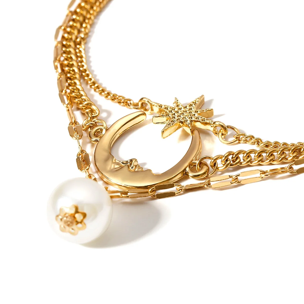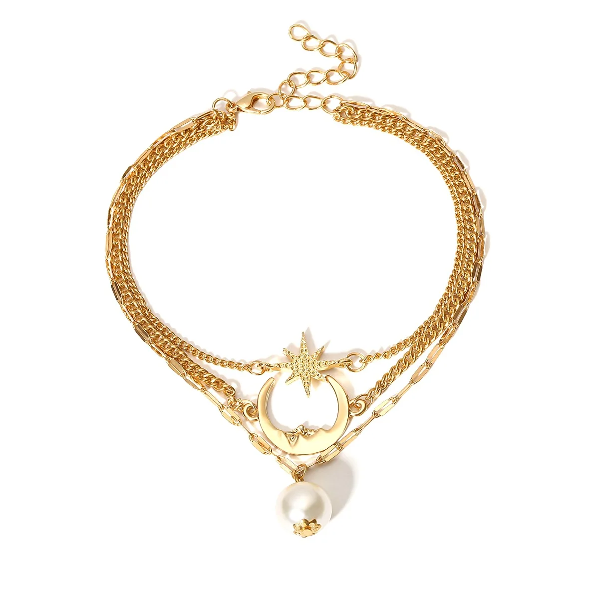 Богемные браслеты на ногу-анклет для женщин и девушек, Изящные Ювелирные украшения на ногу с 3-слойным жемчугом, луной, звездой, цепочками на ногу, летняя пляжная мода