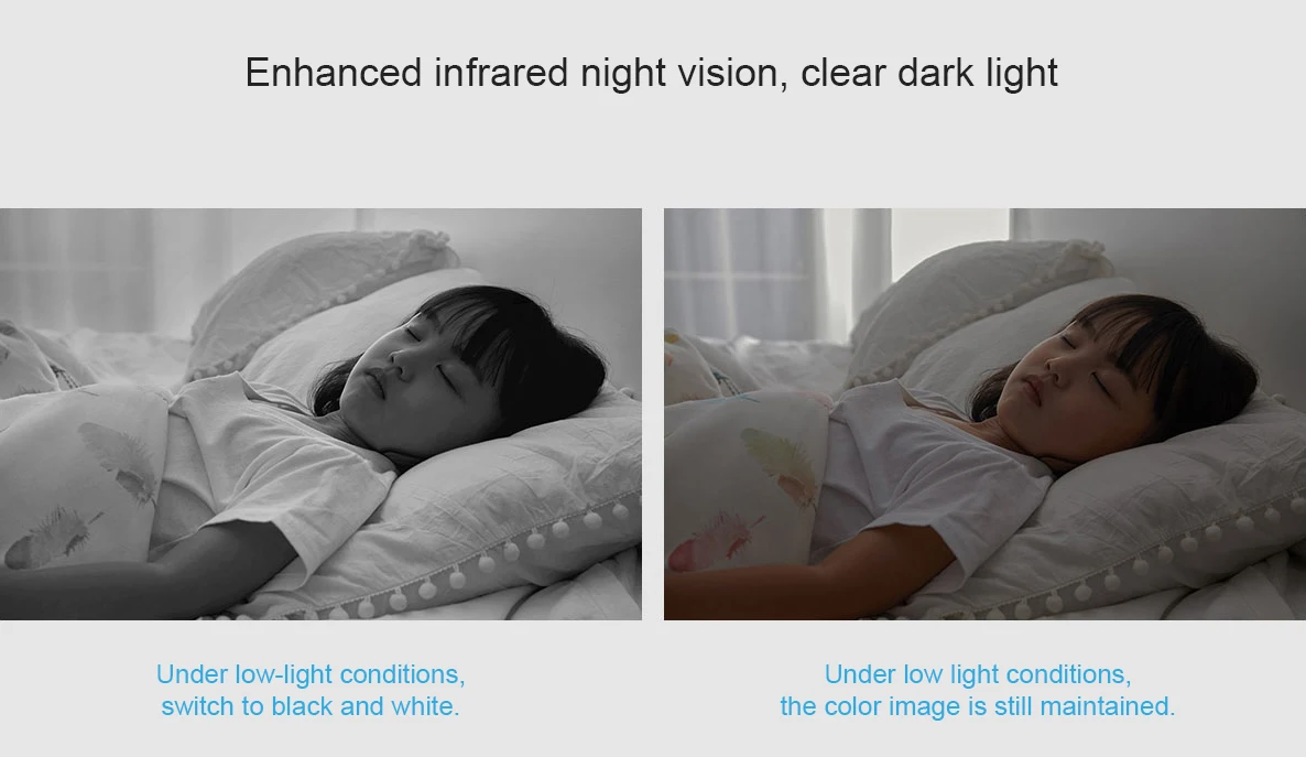 Улучшенное инфракрасное ночное видение, прозрачный Темный светильникВстроенный инфракрасный заполняющий светильник 940nm, не подверженный воздействию красного цвета в ночное время, дает членам семьи опыт сна; С высокочувствительным датчиком изображения, он также представляет цветные изображения в условиях, когда светильник находится на низком уровне.При низком уровне светильник переключается на черный и белый.Немерцающая полноцветная камераПри низкой светильник условий, цветное изображение по-прежнему в хорошем состоянии.Смарт-Камера Xiaomi PTZ версия 2K