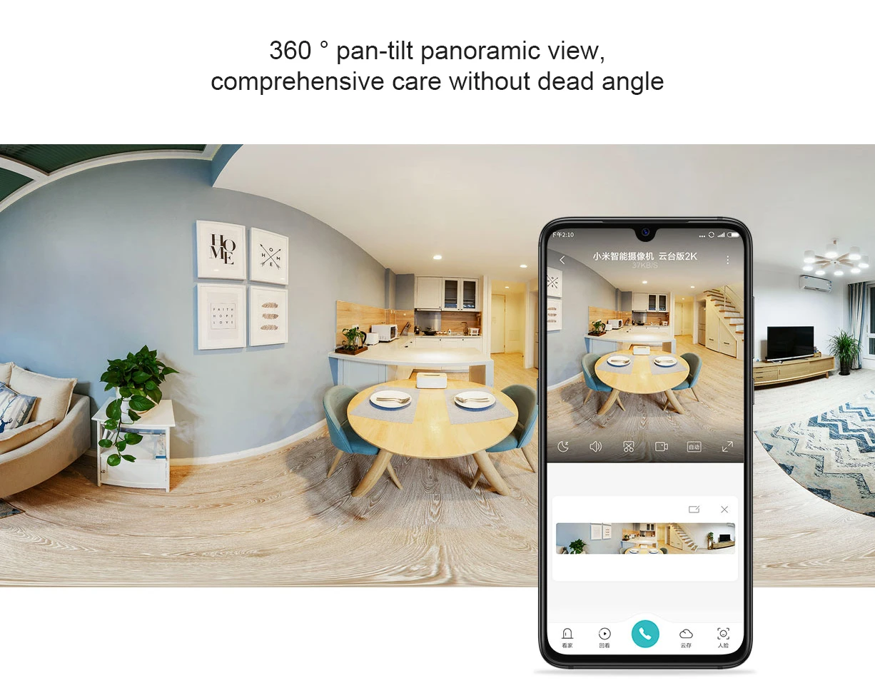 Панорамный обзор с поворотом на 360 °, всесторонний уход без мертвого углаПринять двойной дизайн головки двигателя, 360 ° Горизонтальный угол обзора, 108 ° Вертикальный угол обзора. Управление приложением Mijia, панорамный рисунок, чтобы увидеть, что означает.