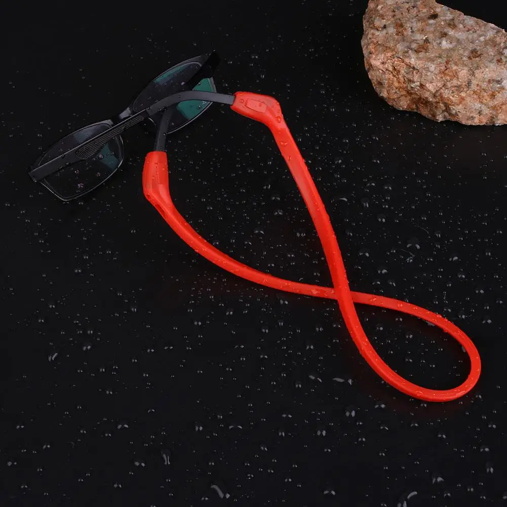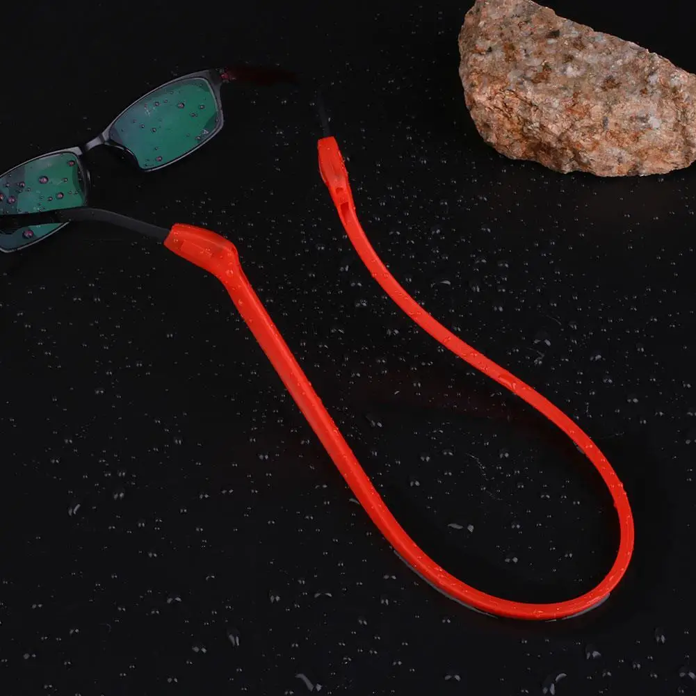 Технические характеристики:Состояние на 100% абсолютно новыйЦвет: красный, зеленый, желтый, синий, черный (переменный)Материал: силиконРазмер изделия: Общая длина: 45 см, ширина: 0,7 см, длина дужки для очков: 2,6*1,3 смПосылка включает в себя:1 шт. силиконовый ремешок для очков