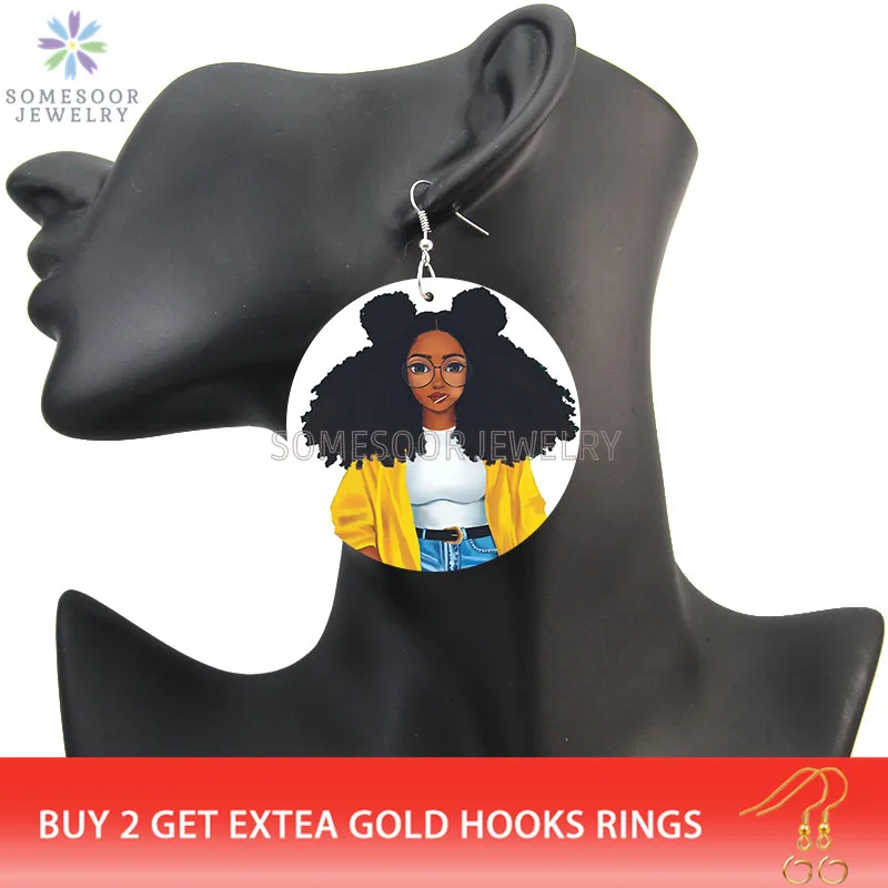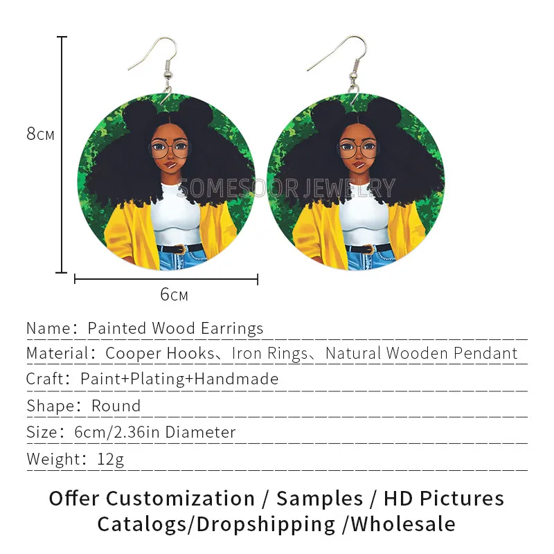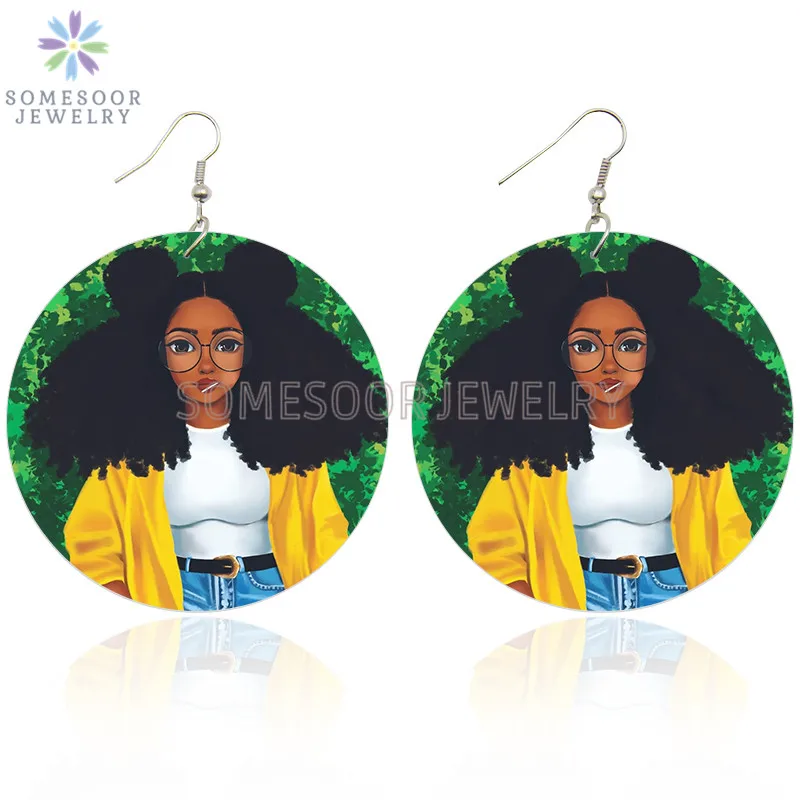 SOMESOOR милые кудри девушка деревянные висячие серьги afroцентрические натуральные волосы печатные 6 см большие деревянные круглые фотоаксессуары для женщин Подарки