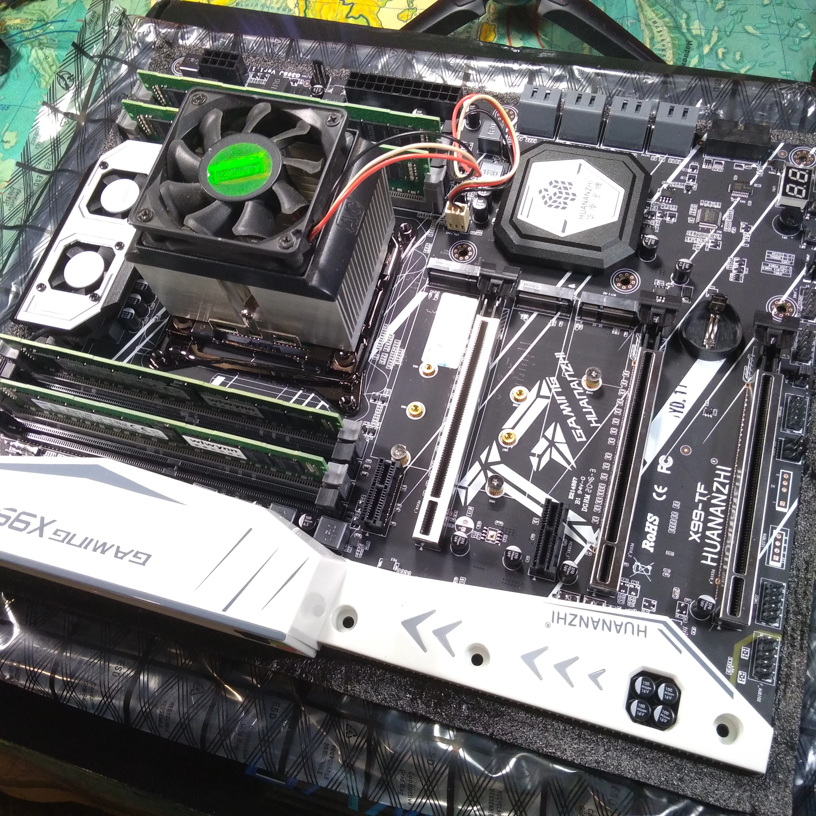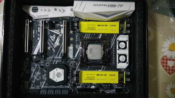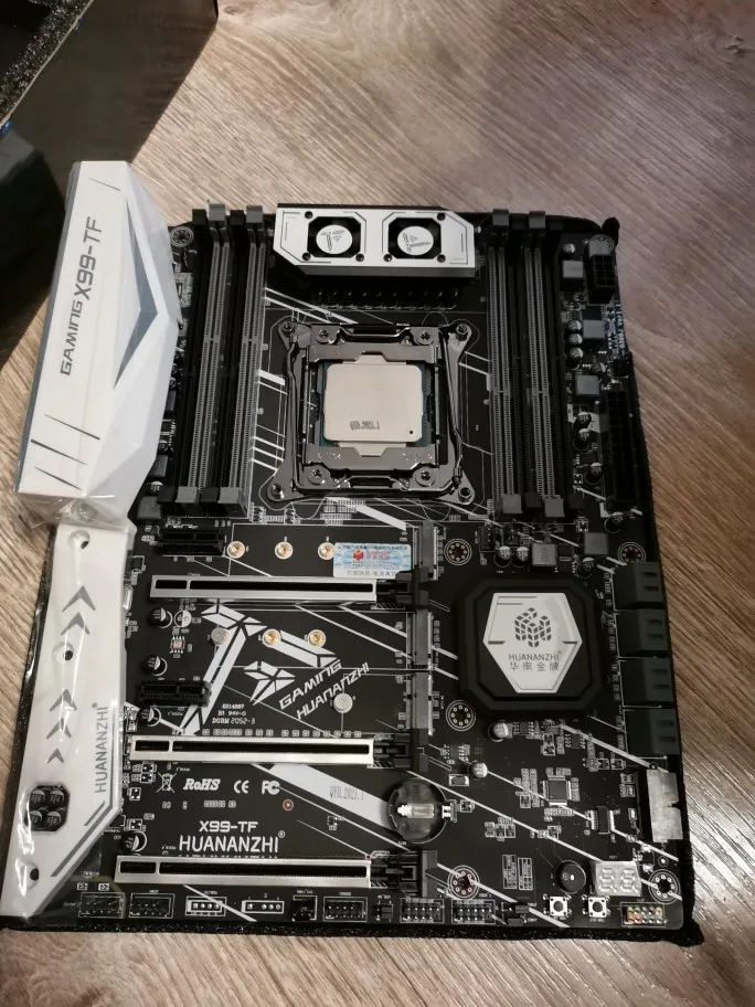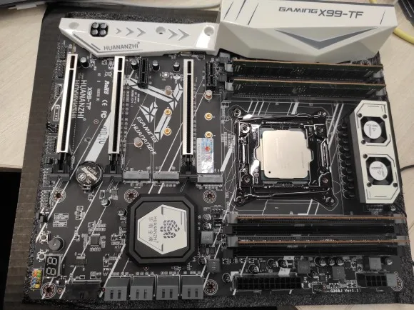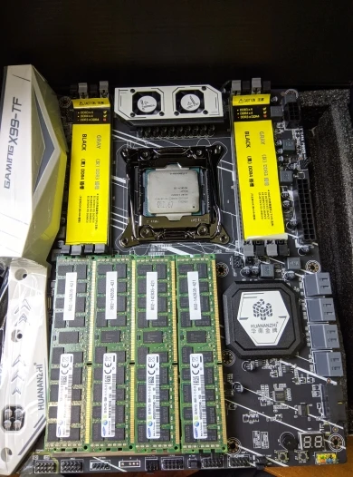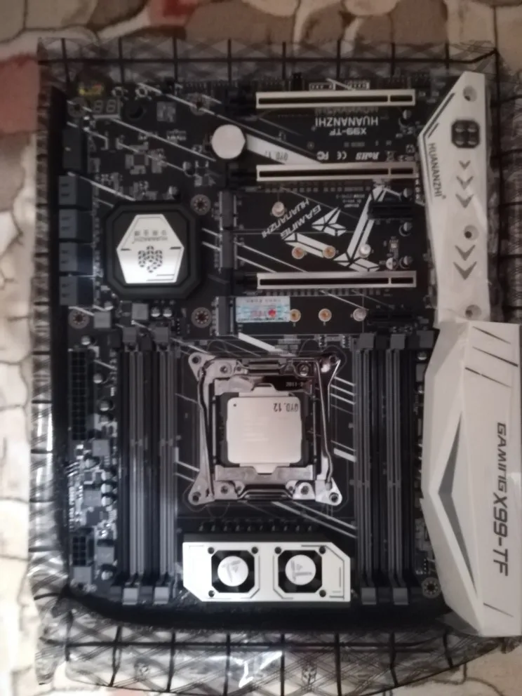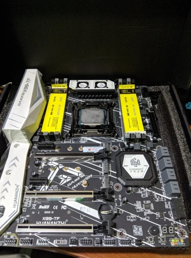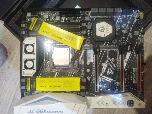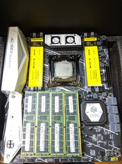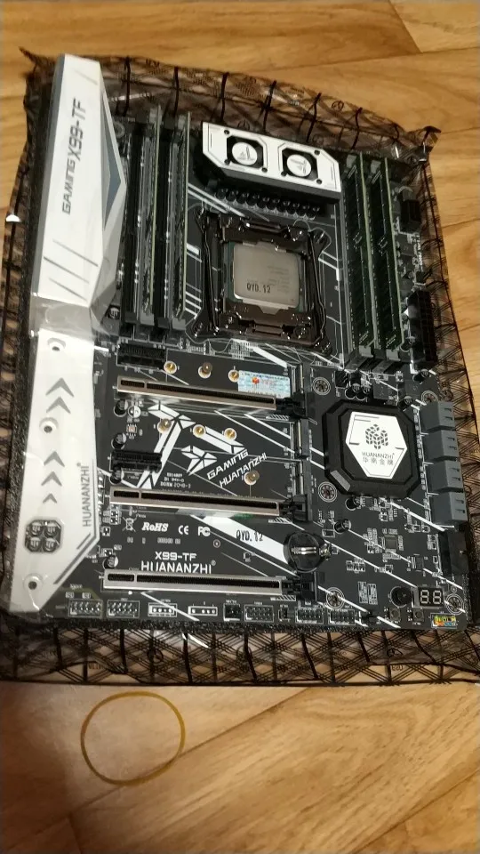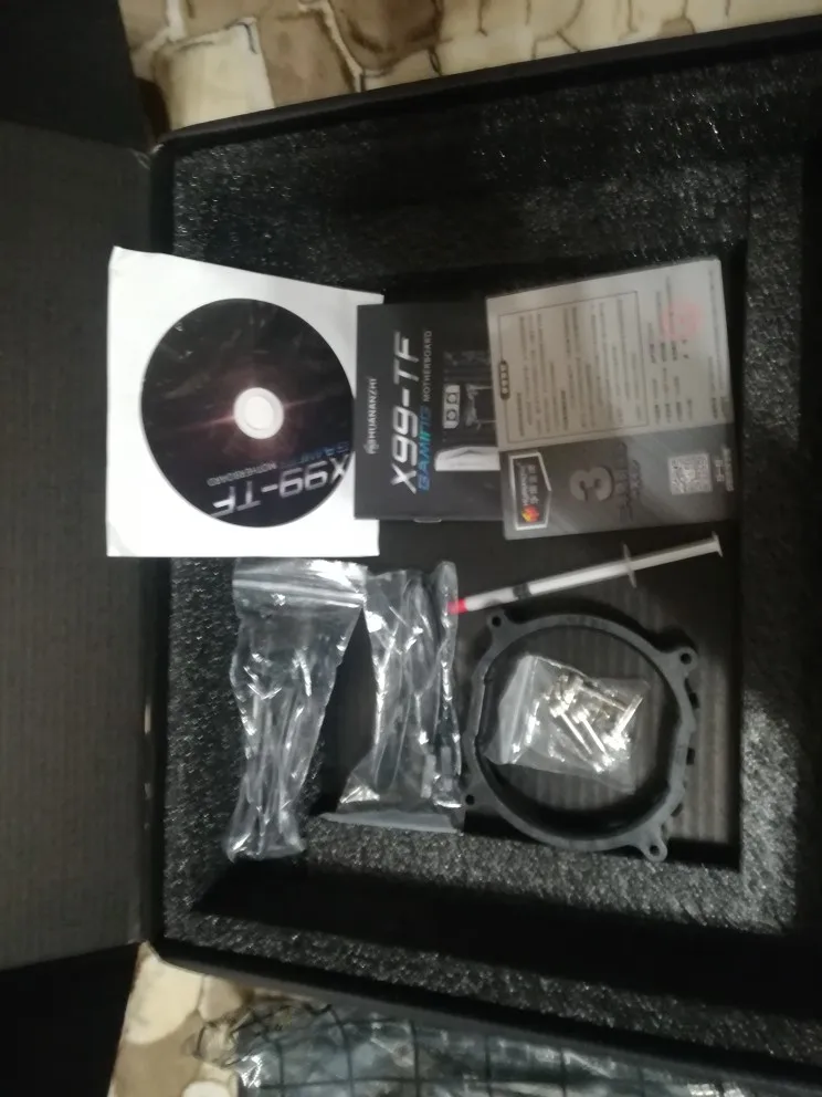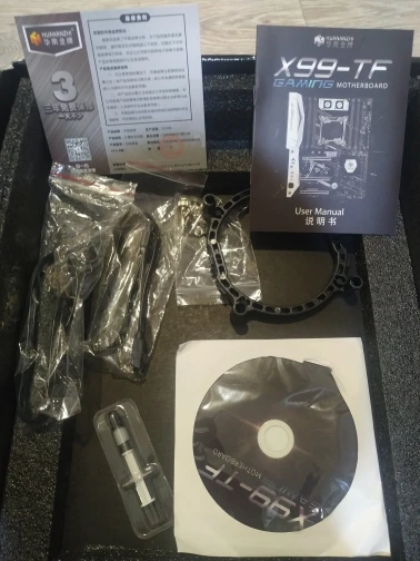 Приехала посылка в предновогодние дни. Думал из-за праздников задержится. Упаковка хорошая, Почта России не смогла ее помять) В комплекте - сама материнская плата, проц 2678 установлен в сокет, память 8х4 в отдельной пупырке. Дополнительно - два SATA кабеля, переходное кольцо под кулер, болты для крепления материнки и переходного кольца, маленький шприц с термопастой, инструкция на китайском, диск с драйверами. Внешне плата очень аккуратно выглядит, пайка качественная, текстолит не гнутый. Полностью сделать тест этого комплекта сейчас нет возможности, так как еще не приехали остальные комплектующие. Накинул маленький кулер, видеокарту - все включилось, в биосе память полностью определилась (ВНИМАНИЕ! С таким кулером использовать НЕЛЬЗЯ! Использовал только для включения на несколько секунд). Когда полностью соберу прогоню на проверку память и сделаю стресс тест в аиде. Если что, дополню отзыв.