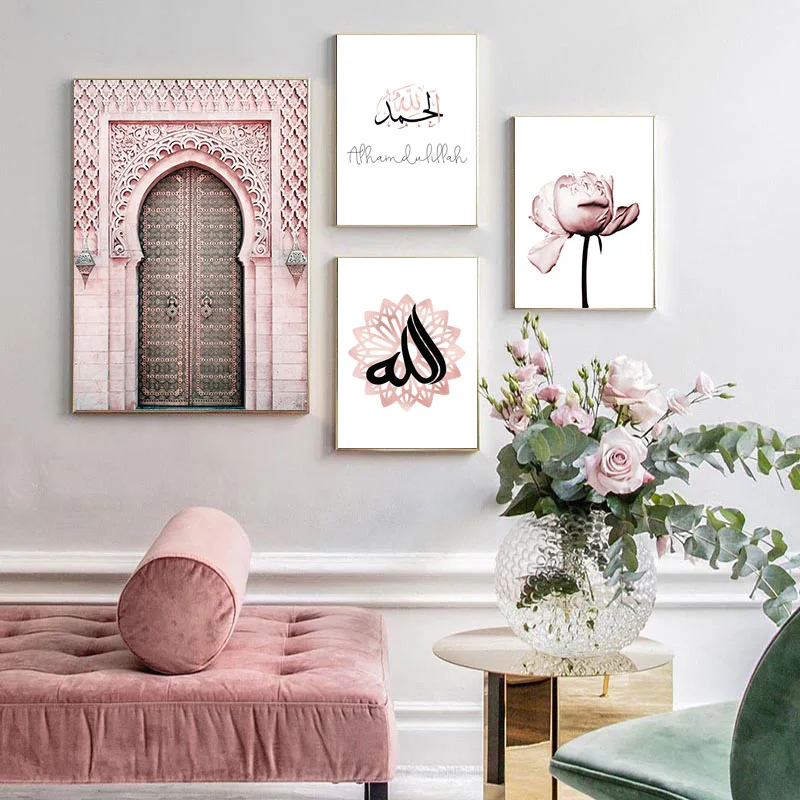 Розовая Марокканская Арка Дверь мусульманская настенная Художественная Картина на холсте Бог исламский скандинавский плакаты принты Настенная картина для современного декора мечетиМатериал: экологически чистый хлопокХарактеристика: солнцезащитный, водонепроницаемый, никогда не выцветает