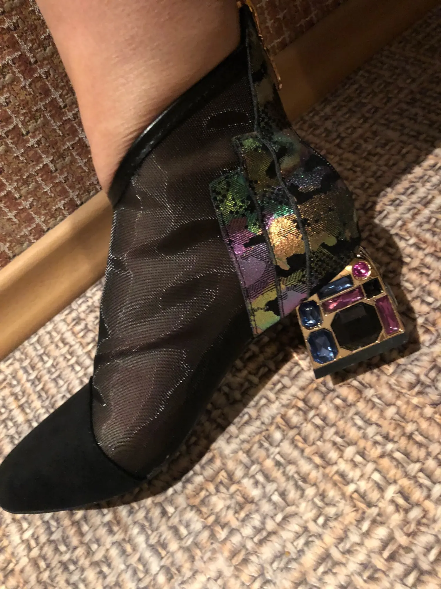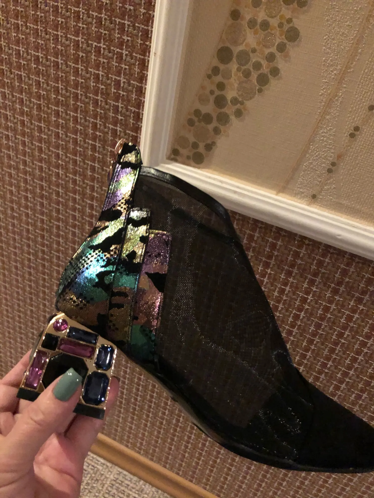 Новинка; Обувь с сеточной подкладкой; Женские сетчатые ботильоны для лета, на среднем каблуке, стразы, с заостренным мыском; Ботинки с перфорацией для женщин; Молния сзади черного цвета